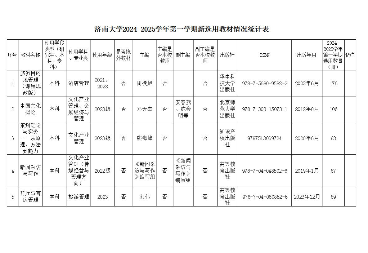 根據(jù)《普通高等學(xué)校教材管理辦法》(教材〔2019〕3 號(hào))和《濟(jì)南大學(xué)教材管理辦法》(濟(jì)大校字〔2021〕86 號(hào))文件精神,為規(guī)范教材選用審核程序,嚴(yán)把教材選用質(zhì)量關(guān),切實(shí)發(fā)揮教材在立德樹人、人才培養(yǎng)、課程育人等方面的作用,更有效地服務(wù)教學(xué)和推動(dòng)教學(xué)質(zhì)量的提升,經(jīng)學(xué)院教材工作領(lǐng)導(dǎo)小組審查,現(xiàn)將我院2024-2025學(xué)年第一學(xué)期本科教材選用意向公示如下,如有異議,請(qǐng)及時(shí)反饋,聯(lián)系電話為0531-89736436。