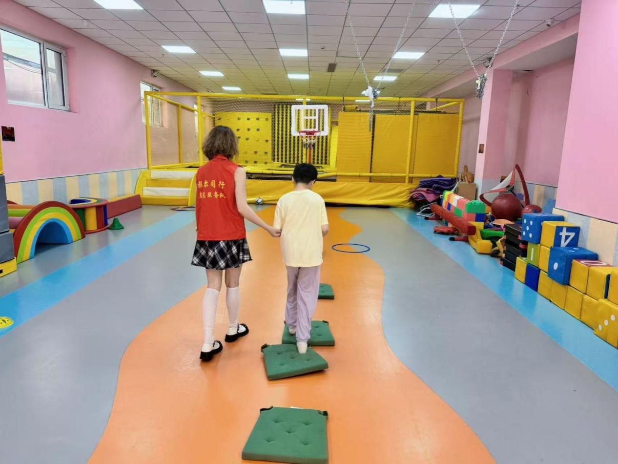康復中心的室內運動場,是孩子們活力釋放的樂園。孫繼佳與孩子們圍聚在一起,開啟了特別的體育課?;@球在地面上跳躍,每一次彈起都伴隨著孩子們的笑聲。孫繼佳耐心地示范著投籃動作,手把手幫助孩子們調整姿勢,鼓勵他們勇敢嘗試。對于一些平衡能力較弱的孩子,孫繼佳會放慢節奏,扶著他們的肩膀,陪著他們慢慢移動腳步,引導他們感受籃球在空中劃過的弧線,在運動中鍛煉平衡能力。在汗水與歡笑交織中,孩子們逐漸掌握了籃球的小技巧,他們的眼神中閃爍著自信與快樂,小小的身軀在運動場上充滿了力量。