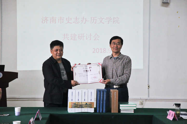 隨后,舉行贈書儀式。牛瑞斌書記代表歷史與文化產業學院接受捐贈(藏書共31套、54冊,總價值25000余元)并致辭。牛書記總結道,本次研討會為學院在歷史文化的研究領域提供了良好的經驗、借鑒和平臺,希望雙方發揮各自優長,一起為建設山東“文化大省”和濟南歷史文化名城做出新的貢獻。