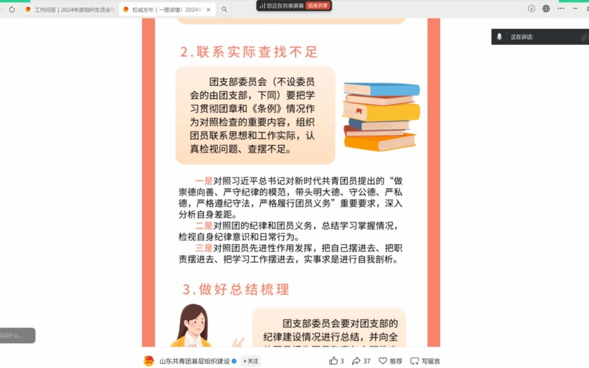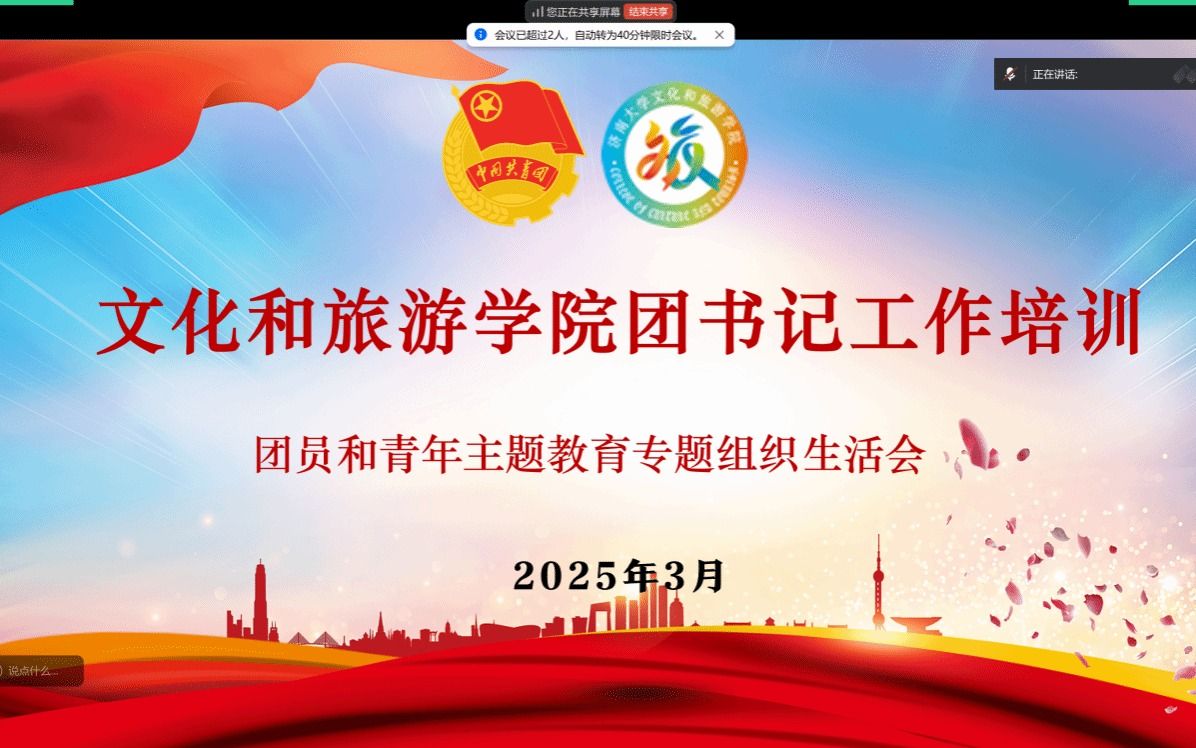 為深入貫徹落實共青團中央關于基層組織建設的相關要求,規范基層團組織生活,提升團員教育管理質量,文化和旅游學院根據《濟南大學關于指導基層團支部召開2024年度組織生活會和開展團員教育評議的工作提示》(以下簡稱《工作提示》),結合示范性組織生活會,于2025年3月3日組織全體團支部書記開展線上組織生活會工作培訓,明確組織生活會基本要求和注意事項。會議由聶安琪同學主持,學院全體團支書參加會議。