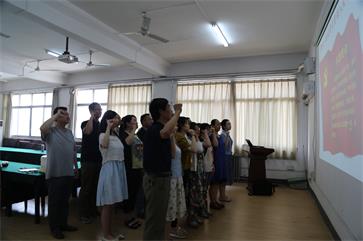 專題黨課第一項內容“迎七一歷文教工黨員重溫入黨誓詞”,在牛瑞斌書記的帶領下,全體黨員重溫了入黨誓詞。面對黨旗,重溫誓詞,鏗然在耳,大家感慨萬端,在這一刻,作為黨員,境界得到凈化,思想得到新的提升。