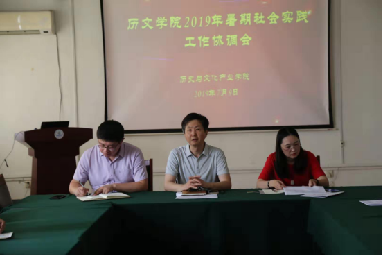 為了更好的指導學生開展暑期社會實踐工作,歷史與文化產業學院于7月9日下午召開了2019年暑期社會實踐工作協調會,學院黨委副書記柳春、學生辦公室主任楊倩出席此次會議,實踐團隊全體成員參加,會議由學院團委書記田海鵬主持。