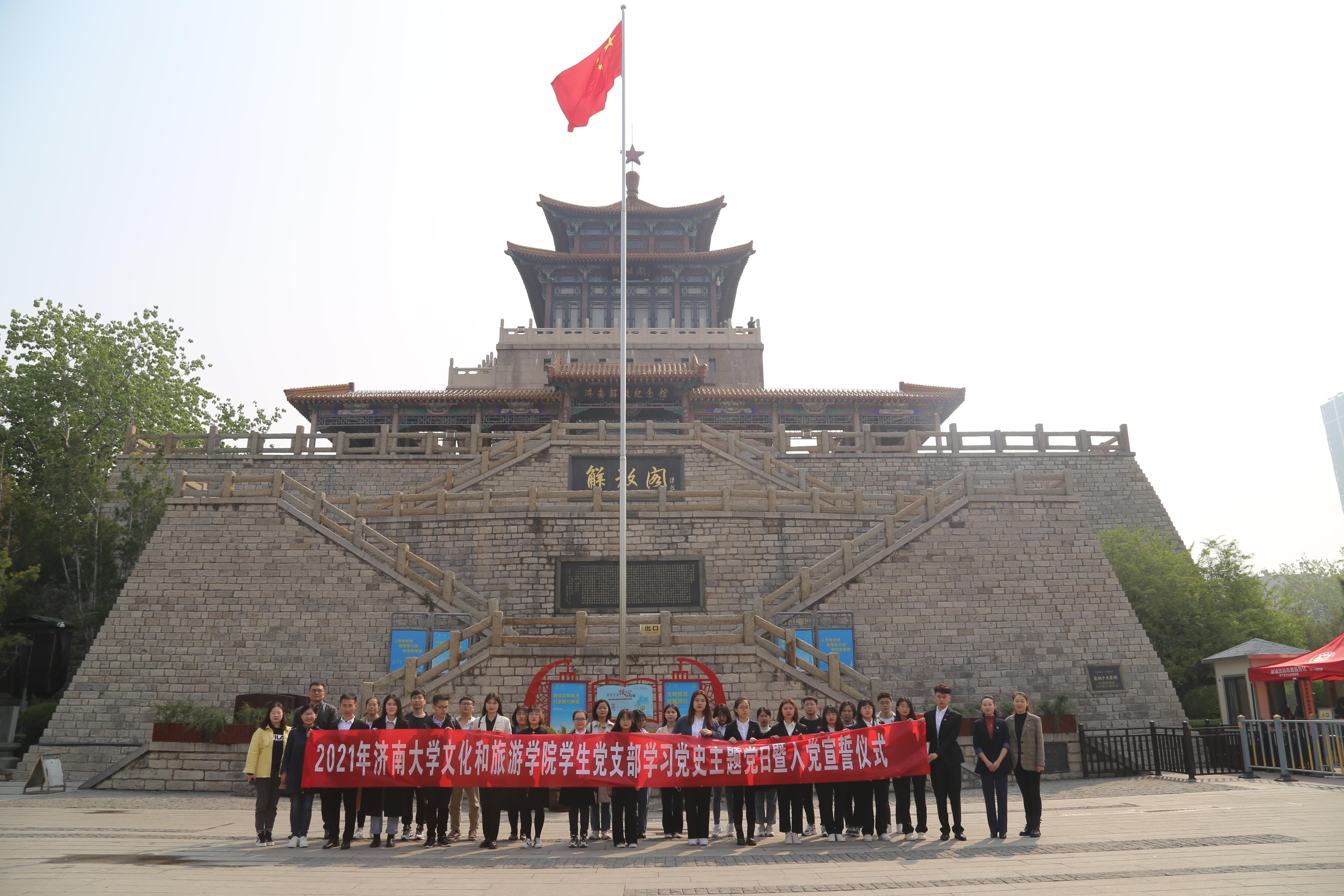 73年前的濟南戰役解放濟南,華東人民解放軍山東兵團經過8晝夜連續作戰,以傷亡2.6萬人為代價,換回了這座城市的永久和平。值此中國共產黨成立100周年之際,2021年4月9日上午9時,濟南大學文化和旅游學院學生黨支部來到濟南市解放閣,開展學習黨史主題黨日暨2021年畢業生預備黨員入黨宣誓大會,2021屆畢業生預備黨員們在感受泉城的厚重歷史中立下初心誓言。