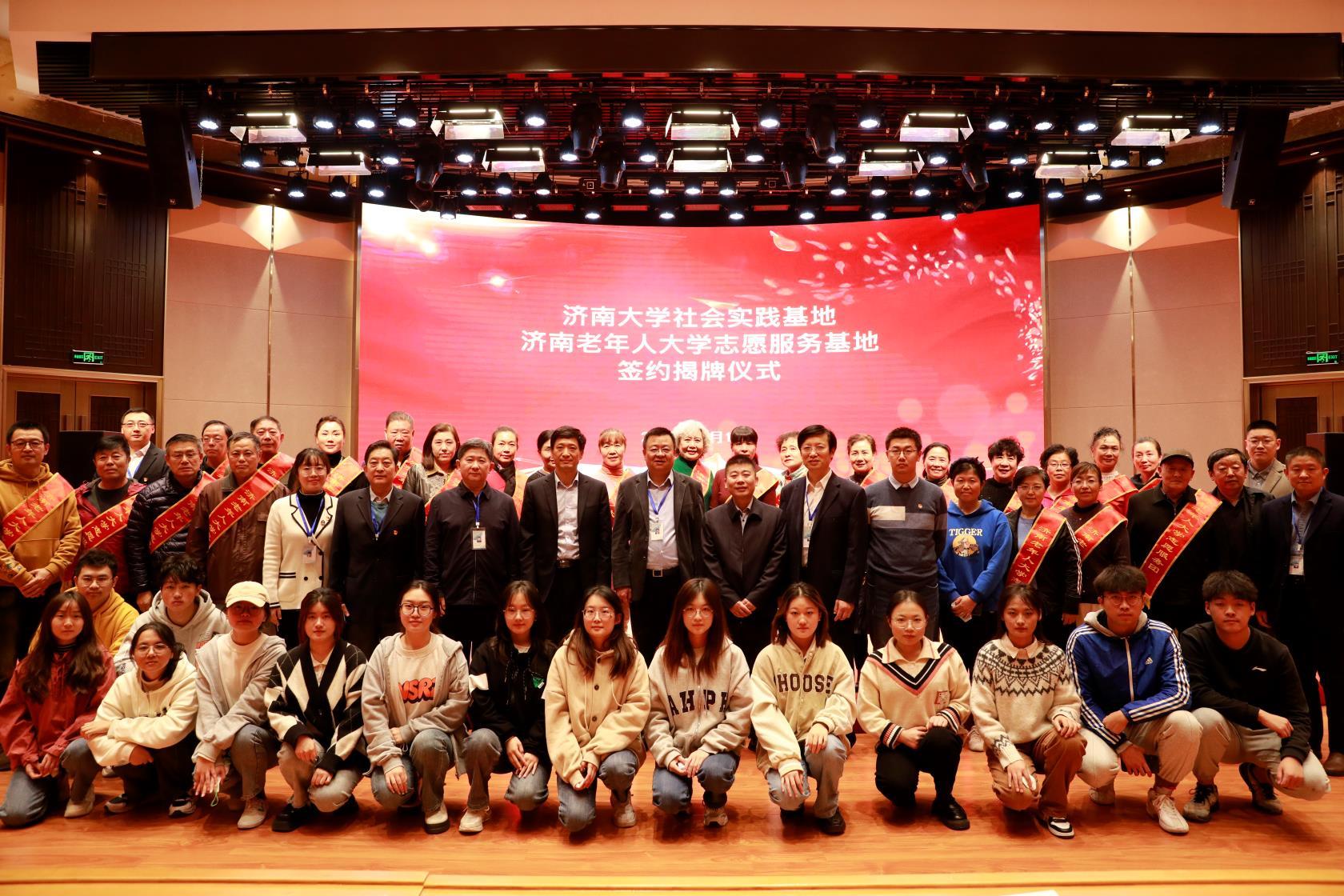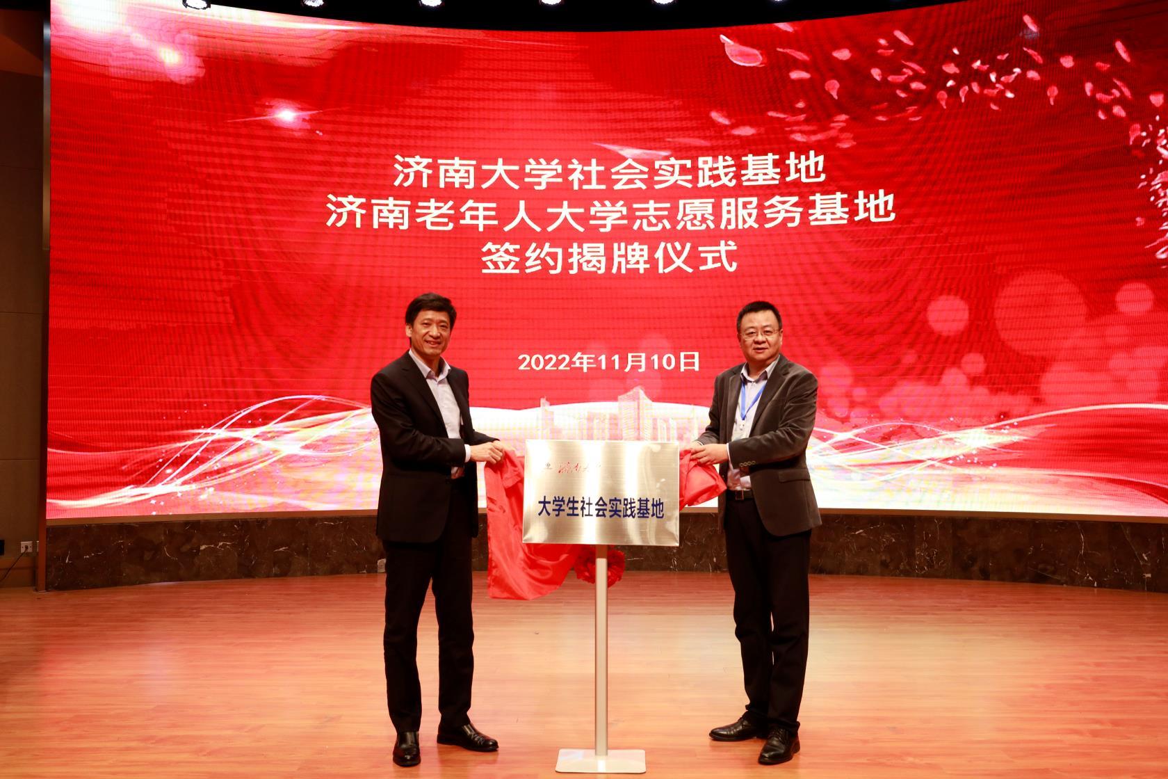 儀式上,雙方簽訂了合作共建協議書。王磊、李曉鐘共同為“濟南老年人大學志愿服務基地”揭牌,孟德洋、溫洪軍共同為“濟南大學大學生社會實踐基地揭牌”。