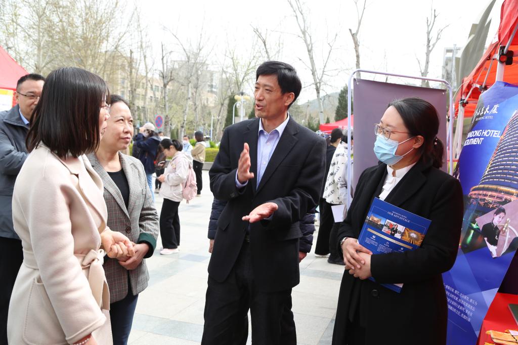 招聘會上,濟南市市中區公共就業人才服務中心主任韓慧、學校黨委學生工作部(處)部長劉芝、黨委學生工作部(處)副部長董俊杰、團委副書記潘穎、學院黨委書記孟德洋與參會企業和學生親切交流,仔細了解用人單位對學校人才培養、就業工作的意見建議,詢問畢業生的就業意向與求職進展。山東凱瑞商業集團、山東大廈、富力凱悅酒店等多家招聘單位表示,感謝濟南大學提供的高質量就業招聘平臺,濟南大學學生專業水平扎實、綜合素質高,除目前正在企業實習的在校生外,企業也有眾多優秀的濟南大學畢業生,已成長為單位發展的中堅力量。下一步企業將進一步加大與學校的交流合作,實現行業需求和畢業生的高效對接。文化和旅游學院畢業生小薛表示,“此次招聘會參展的企業質量高,專業契合度強,給我們提供了豐富的就業機會,收獲很大。”作為酒店管理專業畢業生,在招聘會上他受到不少酒店餐飲集團的青睞,他也結合自己的情況給幾家單位投出了精心準備的簡歷,并與相關用人單位進行了深入交流,初步達成了就業意向。