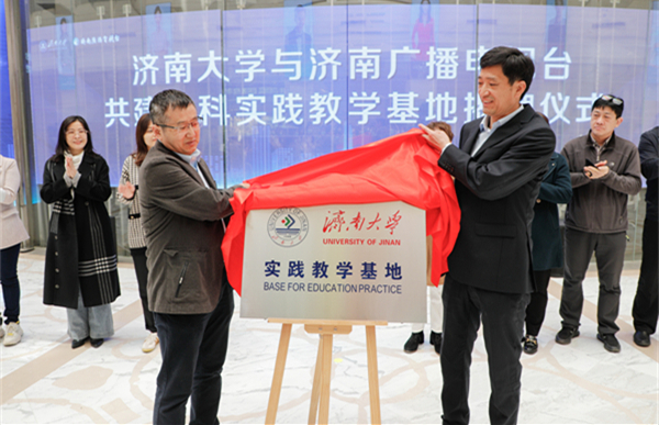 文化和旅游學院黨委書記孟德洋,濟南廣播電視臺黨委委員、副臺長隗銅共同為“濟南大學實踐教學基地”揭牌。