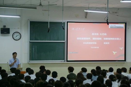 9月19日晚,學院黨委書記孟德洋以《身未動,心已遠,做新時代的文旅人》為主題,為學院2023級364名本科新生講授“開學第一課”。