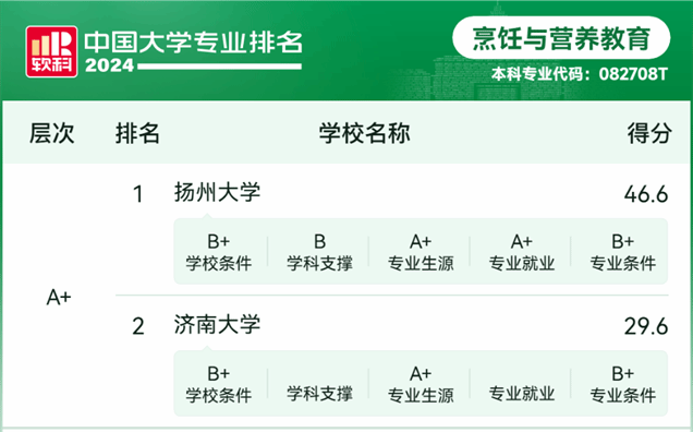 根據2024軟科中國大學專業排名評級規則,專業綜合排名位次為前2%或前2名的為A+級。此次,烹飪與營養教育專業成功上榜A+專業,不僅是對我院在開展專業建設的過程中取得的成果的肯定,也為我院進一步深化專業高質量建設提供了更多的動力。