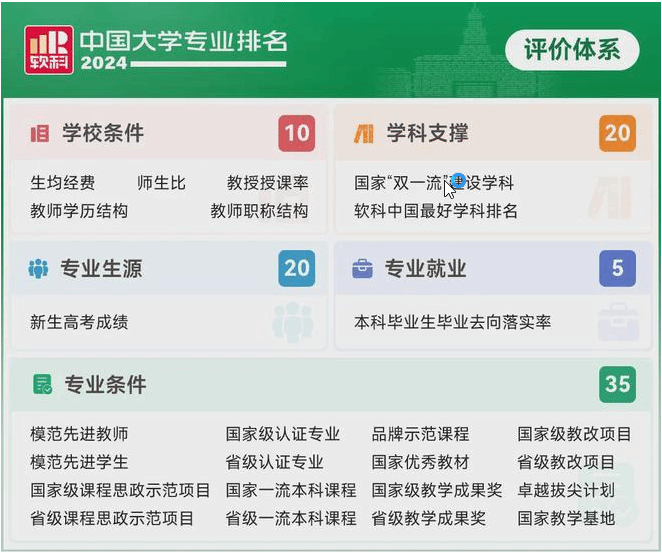 排名指標體系設置包括:學校條件、學科支撐、專業生源、專業就業、專業條件 5個指標類別,共25項測量指標。