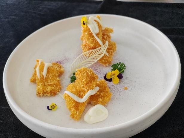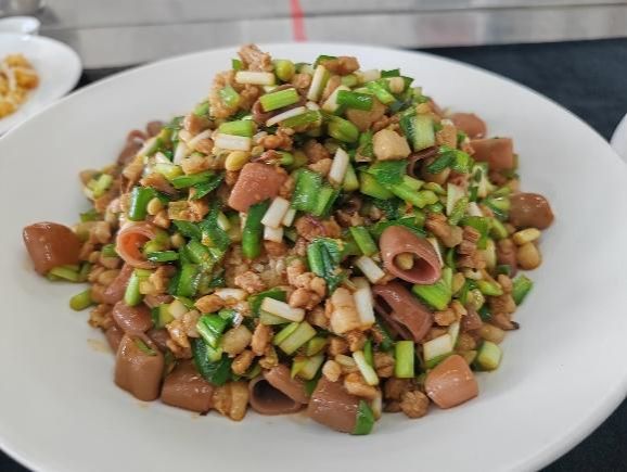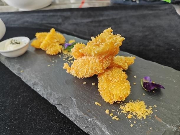 第三天,同學(xué)們赴煙臺文化旅游職業(yè)學(xué)院。學(xué)院將膠東飲食文化深度挖掘,實訓(xùn)教室中的非遺文化展區(qū),讓同學(xué)們贊不絕口。在后續(xù)的學(xué)習(xí)中,中國烹飪大師、二級教授鄧介強老師帶來“海腸撈飯”“炸龍利魚排”“油爆海螺”三款膠東名菜教學(xué)。“海腸撈飯”選用鮮活海腸,醬汁調(diào)配獨家秘方;“炸龍利魚排”對選材、腌制、裹粉和火候把控要求嚴格;“油爆海螺”選活螺,去腥增脆有妙招。同學(xué)們分組實操炸魚排,從最初的手忙腳亂到在老師指導(dǎo)下炸出金黃酥脆的成品,收獲滿滿成就感爆棚。