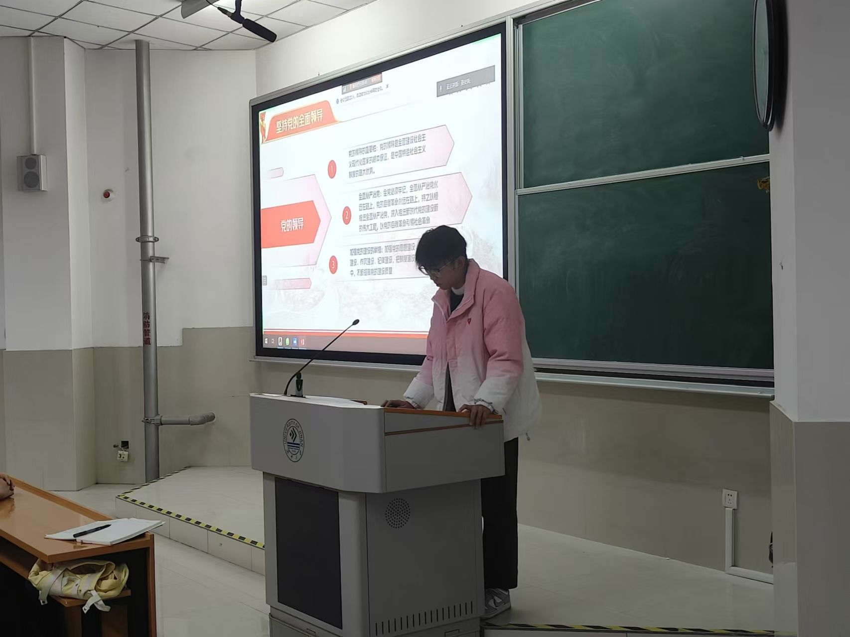 楊鑫祎同學特別提到了新時代十年的偉大變革,通過展示我國建成世界最大的高速鐵路網、高速公路網等基礎設施建設的重大成就,讓學子們深刻感受到國家的發展和進步,增強了對中國特色社會主義道路的自信。同時,號召全體團員,新時代十年的偉大變革來之不易,要增強憂患意識、堅持底線思維,發揚斗爭精神,主動應對各種風險挑戰,勇于進行斗爭。