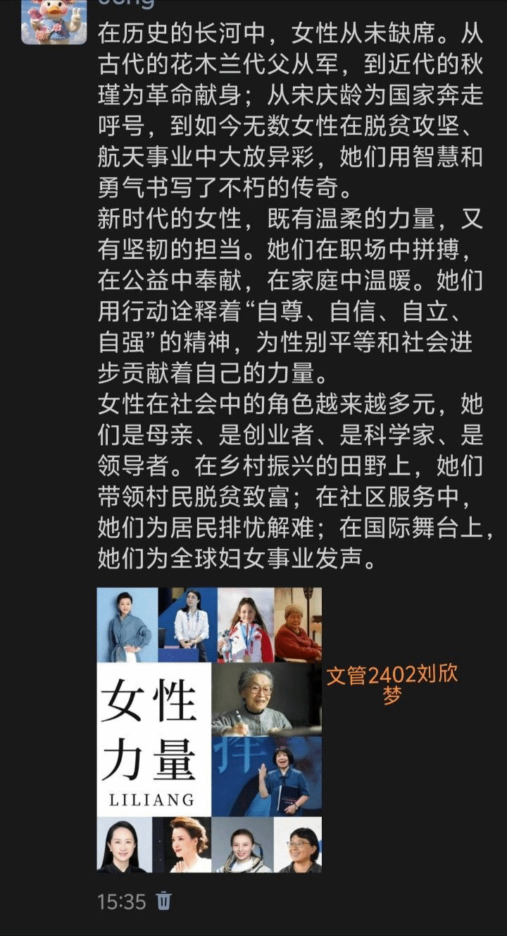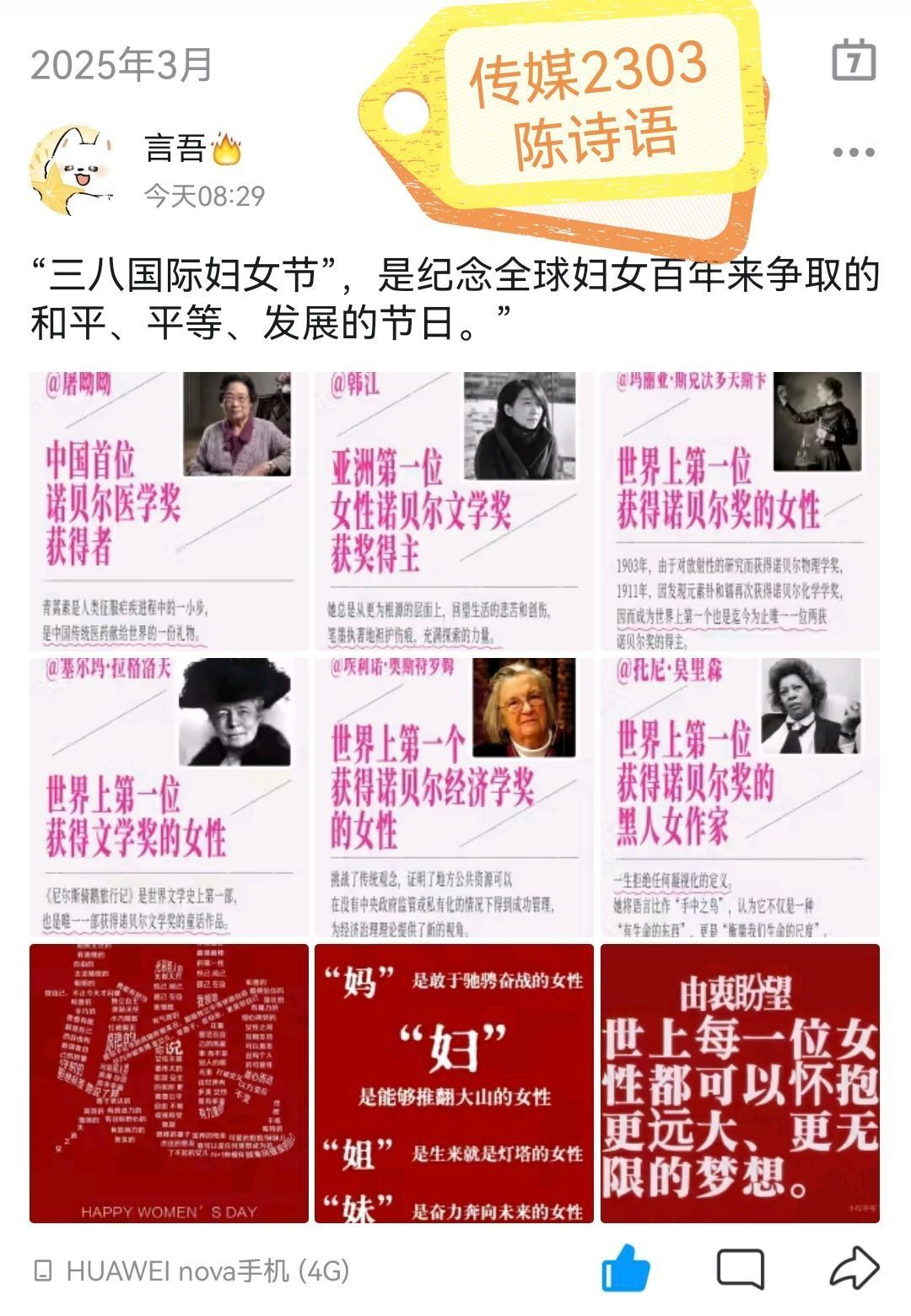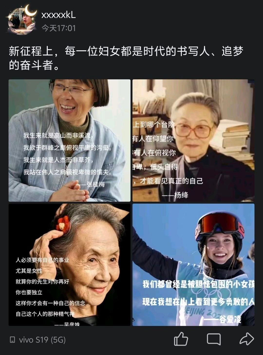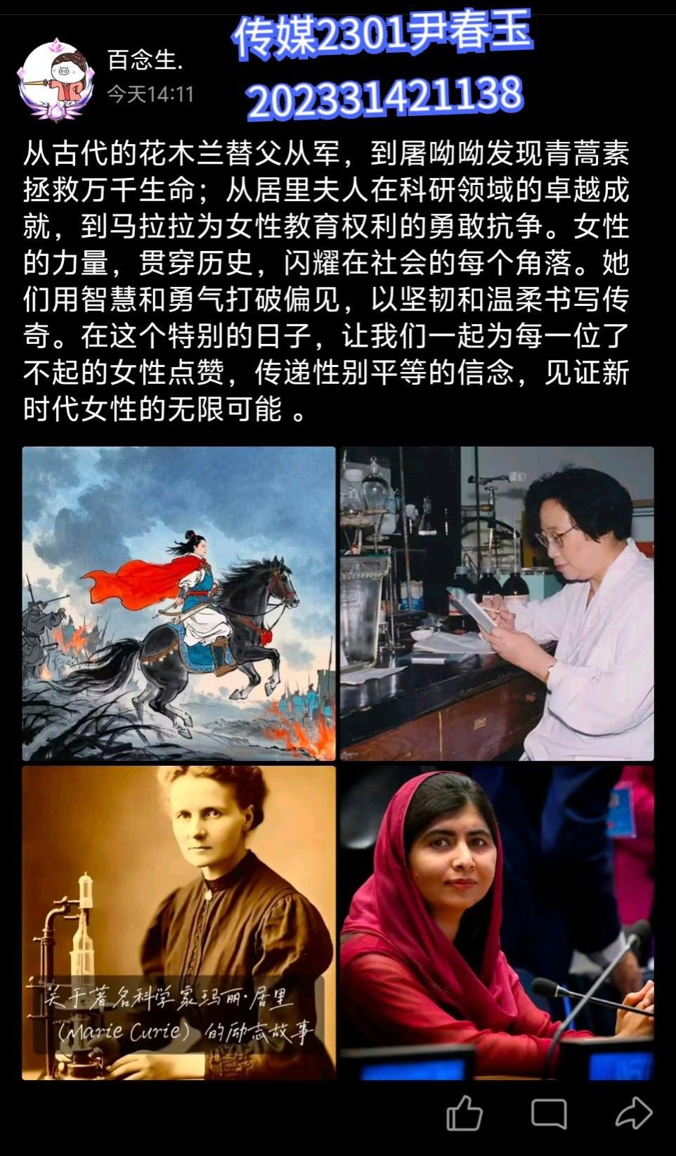此次活動充分利用社交媒體互動性強、傳播范圍廣的特點,鼓勵全體學生在朋友圈、QQ空間、微博、短視頻平臺等渠道,發布鼓舞、贊譽女性的原創圖文。同學們積極響應,深挖女性在歷史演進、社會進步、科技創新等不同領域的卓越成就,從古代的巾幗英雄到當今的科研先鋒,用青年特有的視角與表達方式,展現“她力量”的熠熠光輝。