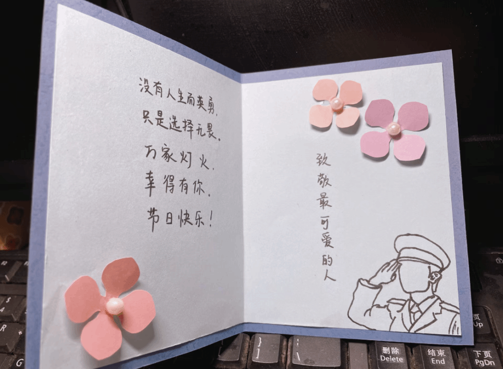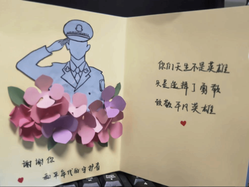 在這個虛擬的活動“現(xiàn)場”,雖然大家身處不同空間,但熱情絲毫不減。志愿者們化身貼心的線上引導(dǎo)員,通過精心制作的視頻展示警察們那些不為人知的感人瞬間、危難時刻挺身而出的英勇事跡以及日常守護的平凡點滴,這些內(nèi)容一經(jīng)播放,便牢牢抓住了同學(xué)們的目光,為大家開啟了創(chuàng)意的源泉,助力同學(xué)們更好地構(gòu)思自己的作品。觀看完視頻后,同學(xué)們便沉浸到便簽和賀卡的制作中,為人民警察寫下真摯的祝福、感謝話語或繪制飽含深情的相關(guān)圖案,以此表達對警察群體的崇高敬意與贊美之情。