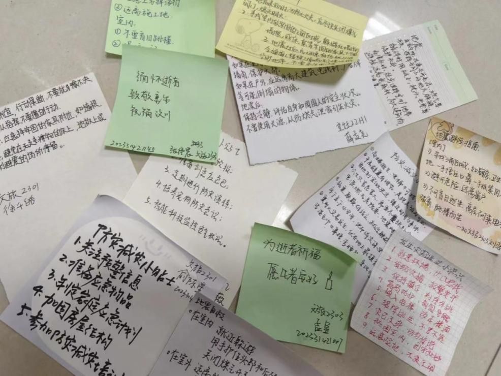 活動伊始,同學們進行了短暫的默哀儀式,表達對汶川地震中遇難同胞的深切哀悼和對災區人民的關心。隨后,他們在便利貼上寫下自己所了解的防震減災小知識,如“密切關注預警信息”、“提前準備應急物質、制定應急方案”等,并將這些便利貼粘貼到活動展板上。