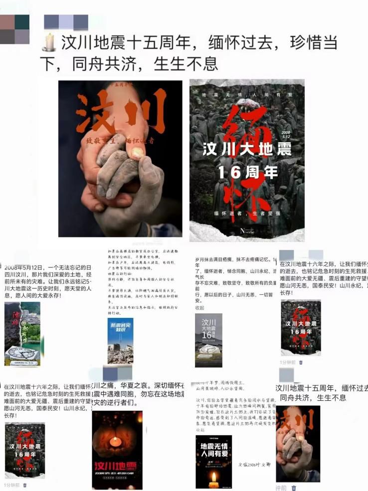 另外,同學們還通過社交媒體平臺,轉發有關汶川地震以及防震減災的文案與宣傳圖片,擴大宣傳覆蓋面,讓更多人加強對防震減災的關注。活動負責人駱敬茹表示:“我們希望通過這樣的活動,讓每一位同學都能深刻認識到防震減災的重要性,掌握基本的自救技能,為創建平安校園貢獻一份力量。”