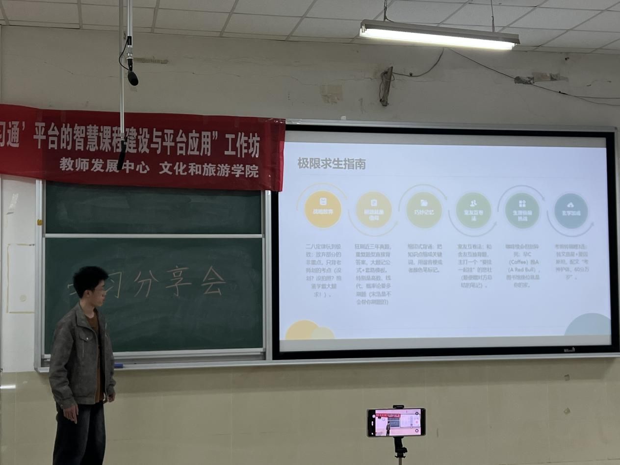 李同學從學習目標、時間管理、個性化學習方法、排除干擾、復習策略等五方面展開,為同學們一一解答疑問,還向同學們分享了網上學習的平臺、ppt制作的資源,并且強調了一二類賽事的重要性。