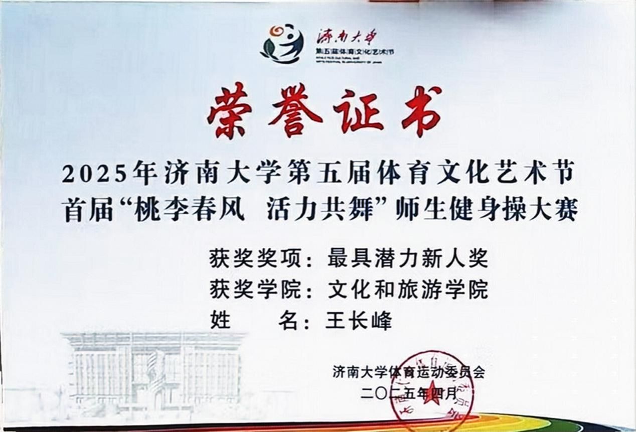 在2025年濟南大學(xué)第五屆體育文化藝術(shù)節(jié)首屆“桃李春風(fēng) 活力共舞”師生健身操大賽中,文化和旅游學(xué)院代表隊身著統(tǒng)一服裝登場,他們動作嫻熟、隊形整齊,贏得現(xiàn)場掌聲陣陣,獲得該項比賽學(xué)生團體第八名的成績。其中,王長峰同學(xué)在團隊中表現(xiàn)出色,榮獲最具潛力新人獎。