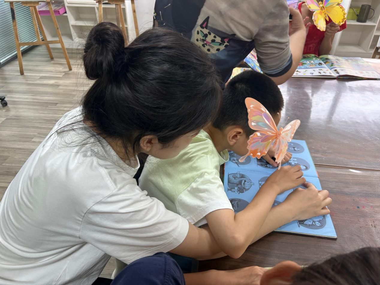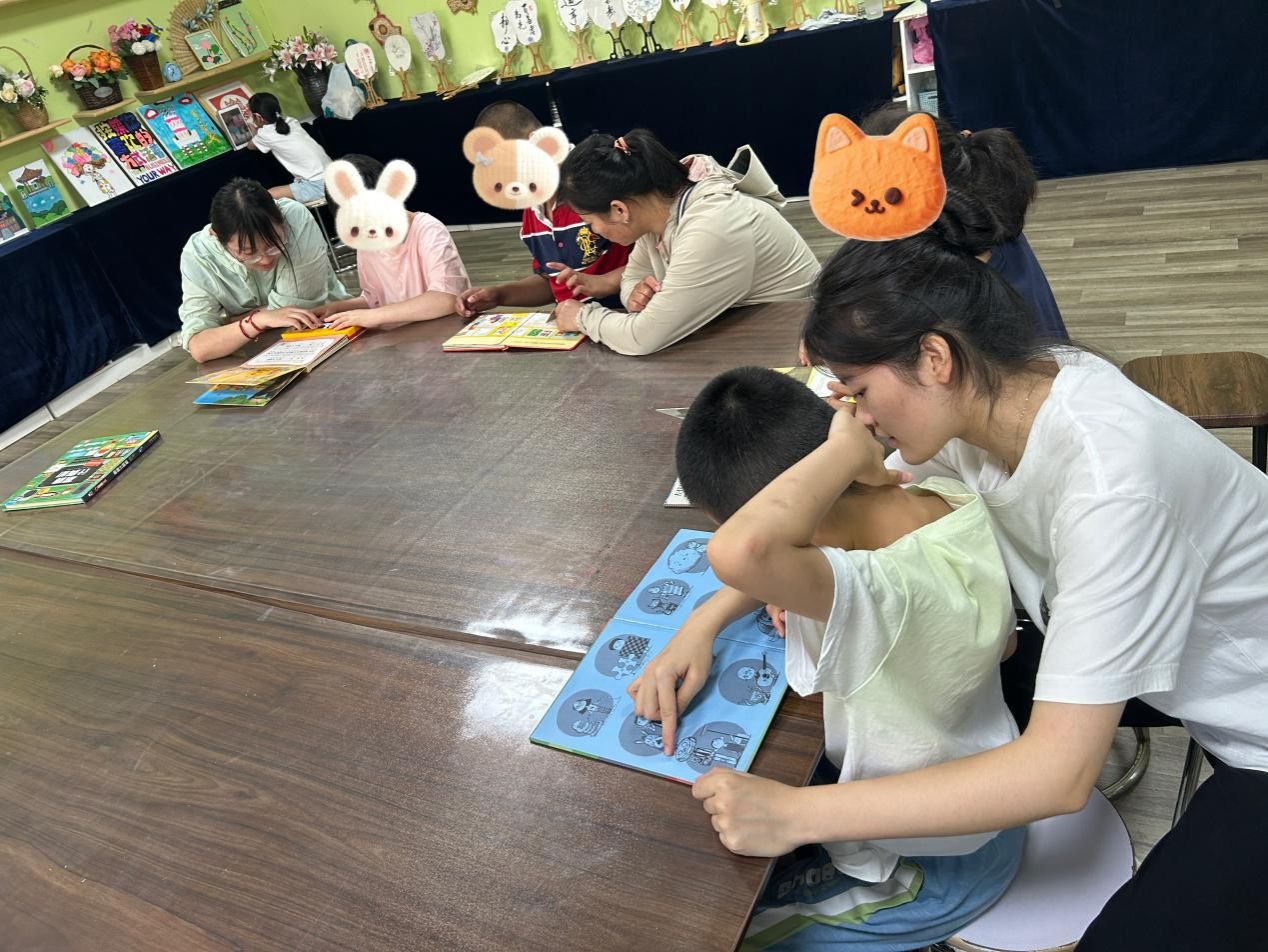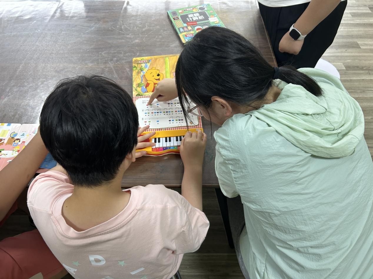 圖書角里,一場融合多元感知的讀書陪伴正在進行。團隊成員拿起特制繪本,引導孩子們觸摸立體模型認知事物,輕按書頁上的鋼琴鍵感受音樂韻律。有的孩子指著立體動物模型輕聲跟讀,有的跟著鋼琴鍵發出的旋律輕輕拍手,每一個細微的反應都讓團隊成員們欣喜不已。這段書香與音符交織的時光,為孩子們打開了一扇認知世界的小窗,也讓知識的種子在陪伴中悄悄萌芽。