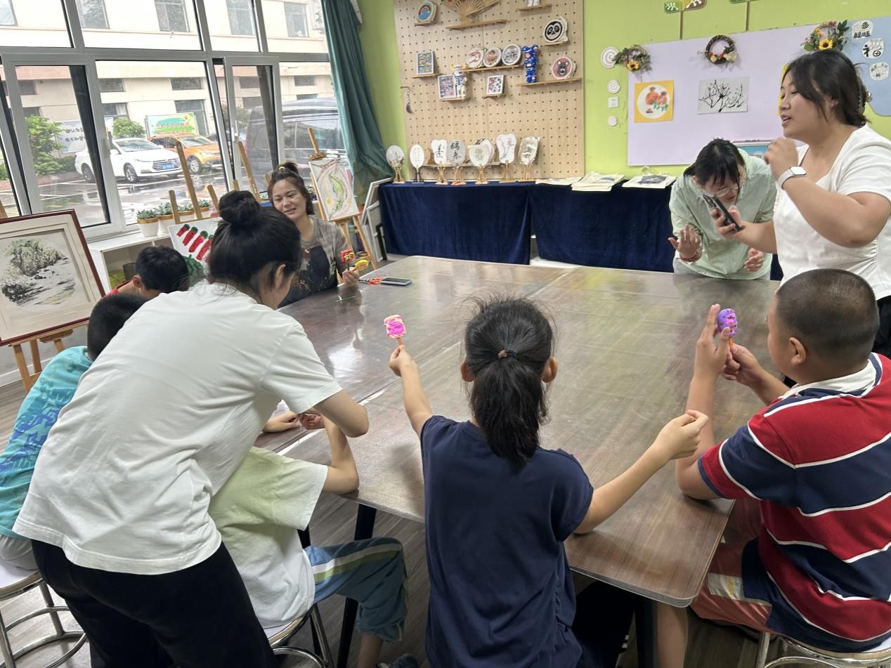 在手工制作課堂上,“粘土雪糕創作”成了孩子們發揮創意的小天地。團隊成員孫琳、秦敬璞、李雨薇將五顏六色的粘土分發給孩子們,手把手教揉、捏、壓的技巧,耐心等待孩子們完成每一個步驟。有的孩子專注地給“雪糕”加上彩色糖粒,有的則發揮想象做出了造型獨特的“創意雪糕”。當一個個形態各異的粘土雪糕擺在桌上時,孩子們臉上露出了自豪的笑容。小小的手工制作,不僅培養了孩子們的動手能力和創造力,更讓他們在創作中收獲了成就感與快樂。