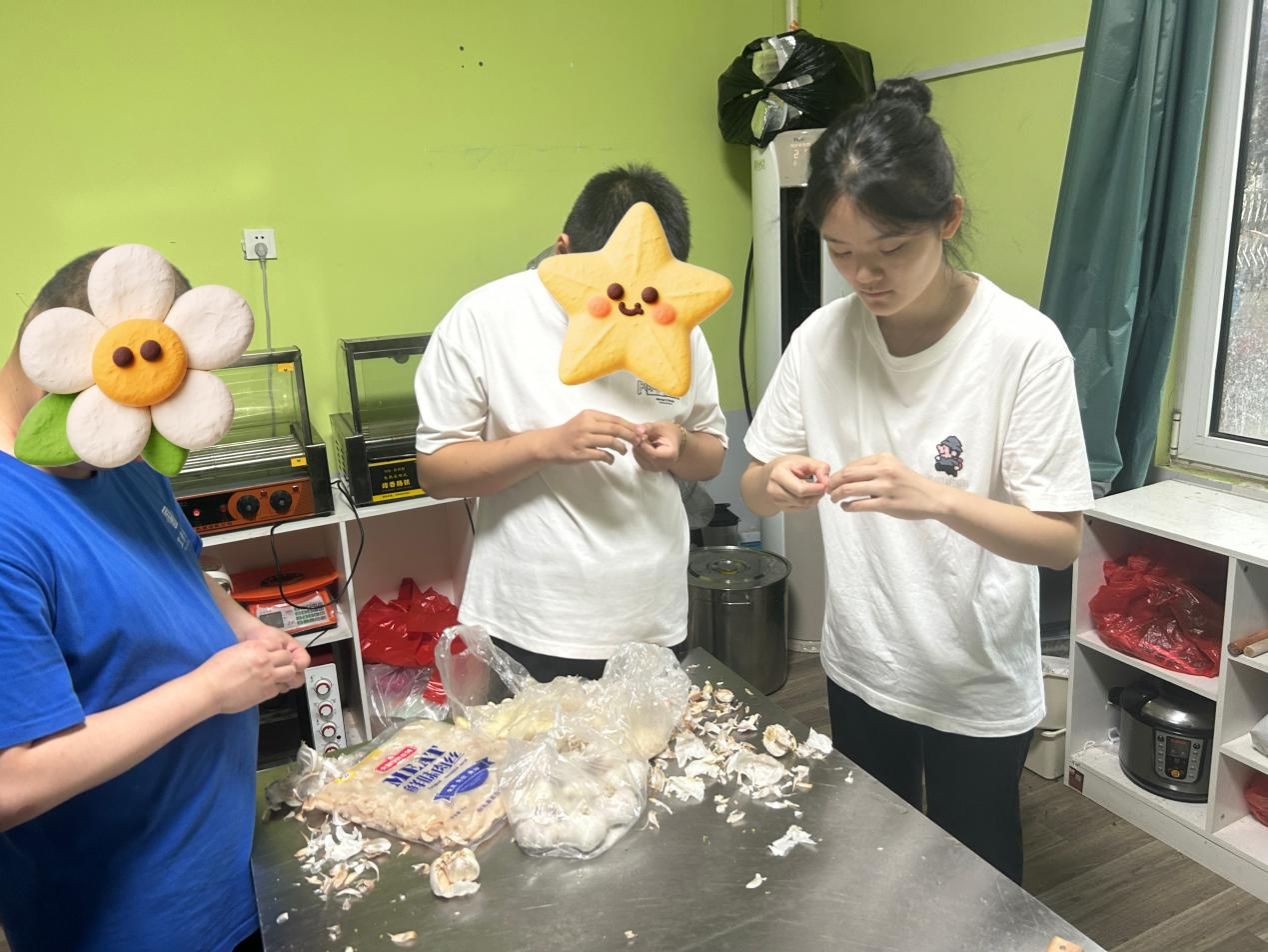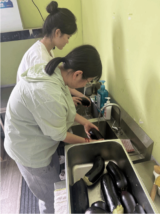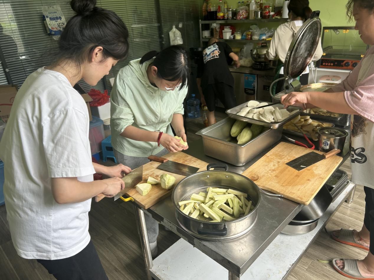 “我們一起來準備午餐的食材吧!”在廚房的操作臺前,團隊成員孫琳、秦敬璞、李雨薇與孩子們開啟了一場特別的“廚藝合作”。剝蒜時,隊員們示范著如何輕輕褪去蒜皮;處理茄子時,隊員們將茄子認真清洗后切條,指導孩子們進行蒸制。孩子們認真模仿的模樣,透著對生活的好奇與向往。當一個個蒜瓣剝凈、一根根茄子切好、一屜屜茄條蒸熟,大家臉上都洋溢著勞動的喜悅。這場廚房協作,不僅讓孩子們體驗了勞動的樂趣,更在分工合作中培養了他們的生活技能與團隊意識。