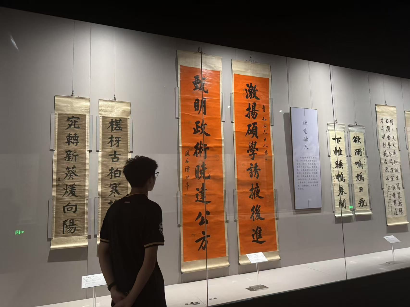 展廳的休息區,一對一的文化答疑悄然進行。隊員陳荇楠、張天健、丘裕涵、白曉涵面對不同需求的參觀者:有人執著于青銅器的鑄造工藝,隊員便畫圖講解失蠟法的步驟;有人困惑于書法的筆法,隊員就拿起紙筆示范提按轉折。對于不善表達的小朋友,隊員們則用“看圖猜年代”的游戲,引導他們主動思考。這種精準的陪伴,讓每個人都能找到屬于自己的文化入口。