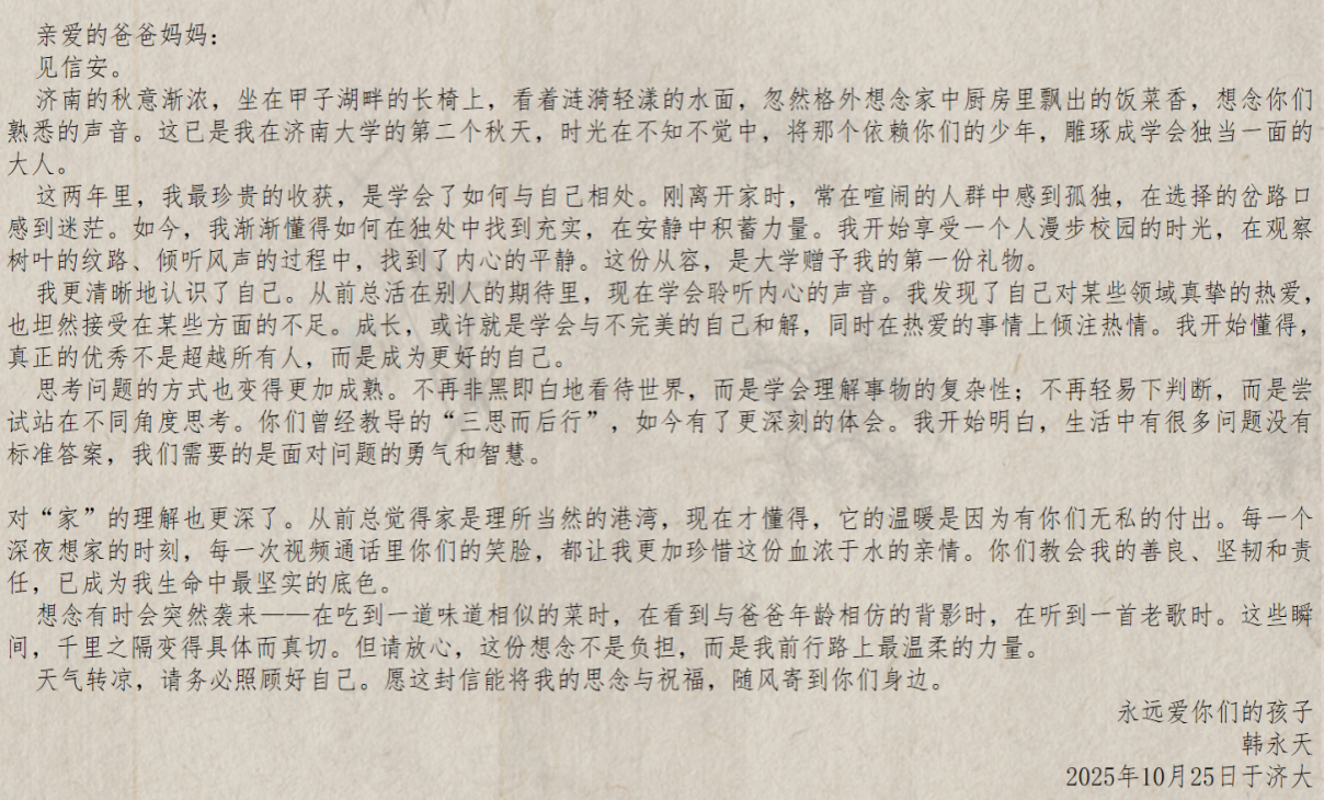 為弘揚尊老敬老的中華優(yōu)秀傳統(tǒng)美德,引導學生關注家庭情感與代際溝通,濟南大學文化和旅游學院心理服務協(xié)會于2025年10月24日至10月31日面向全院學生成功開展了“九九話重陽,青春繪新意”重陽專屬語線上征集活動。活動以重陽節(jié)文化內涵為核心,鼓勵學生通過現(xiàn)代詩文、家書、創(chuàng)意表情包等形式,向長輩表達感恩之情,傳遞青春視角下的傳統(tǒng)文化新意,受到同學們的廣泛關注和積極參與。