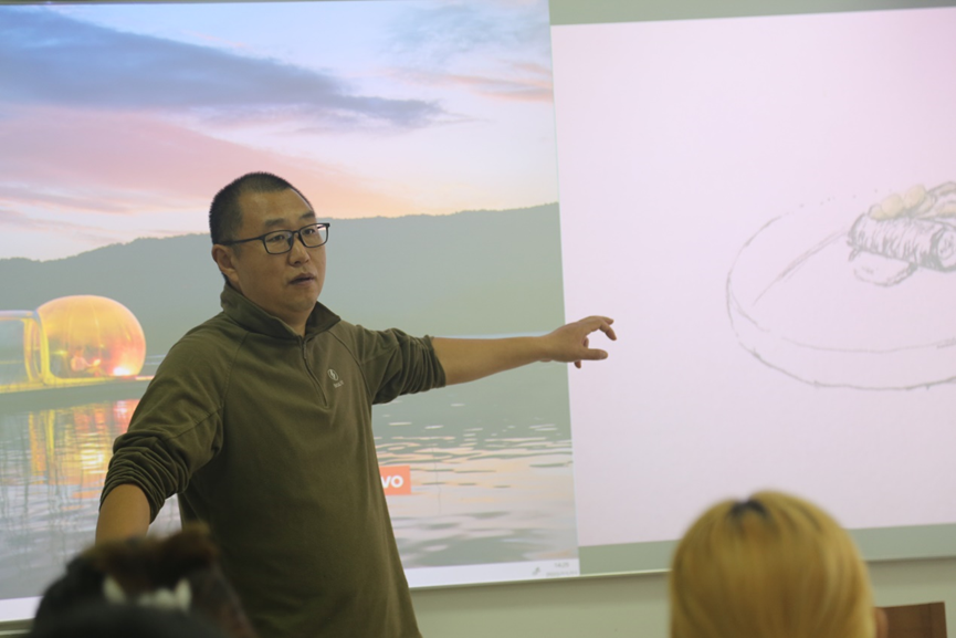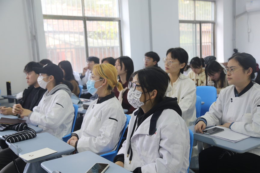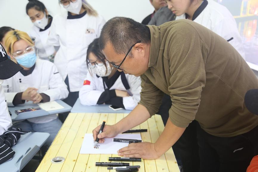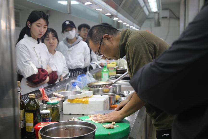 本次藝術烹飪手繪表演活動由中國西餐烹飪大師、餐飲業國家一級評委郭善恒老師為同學們講解。活動剛開始,郭善恒老師講述了餐飲行業中手繪的重要性,呼吁大家進行菜品創新,使菜品朝著精致化、定制化的方向發展。接下來,同學們互相傳看了郭善恒老師的手繪作品,大家對精美的手繪紛紛表示贊嘆。在郭善恒老師現場手繪菜品的過程中,同學們也積極地詢問老師和預制菜、擺盤等相關的問題。活動最后,郭善恒老師在烹飪實驗室邊做邊講解了兩道菜系,教授給了同學們獨特的烹調技巧。