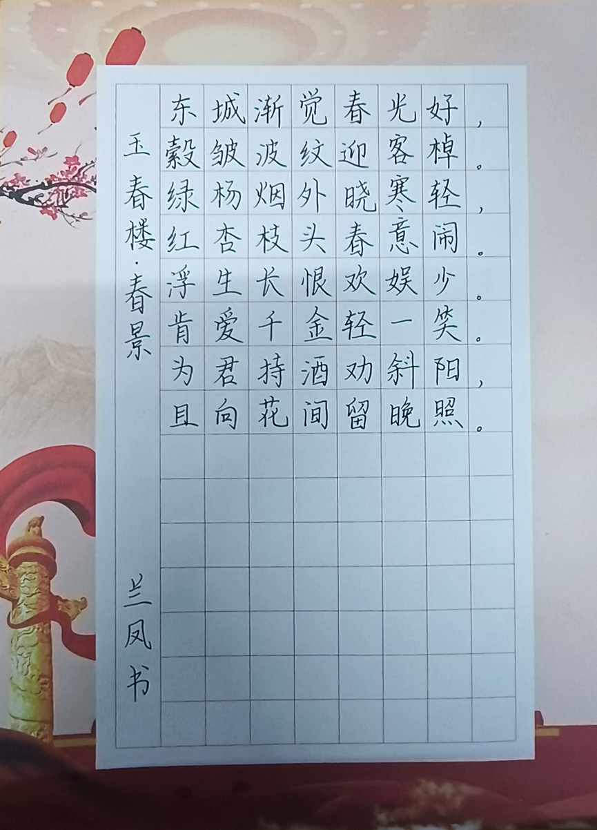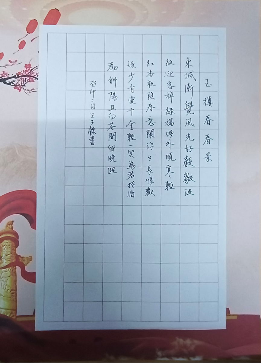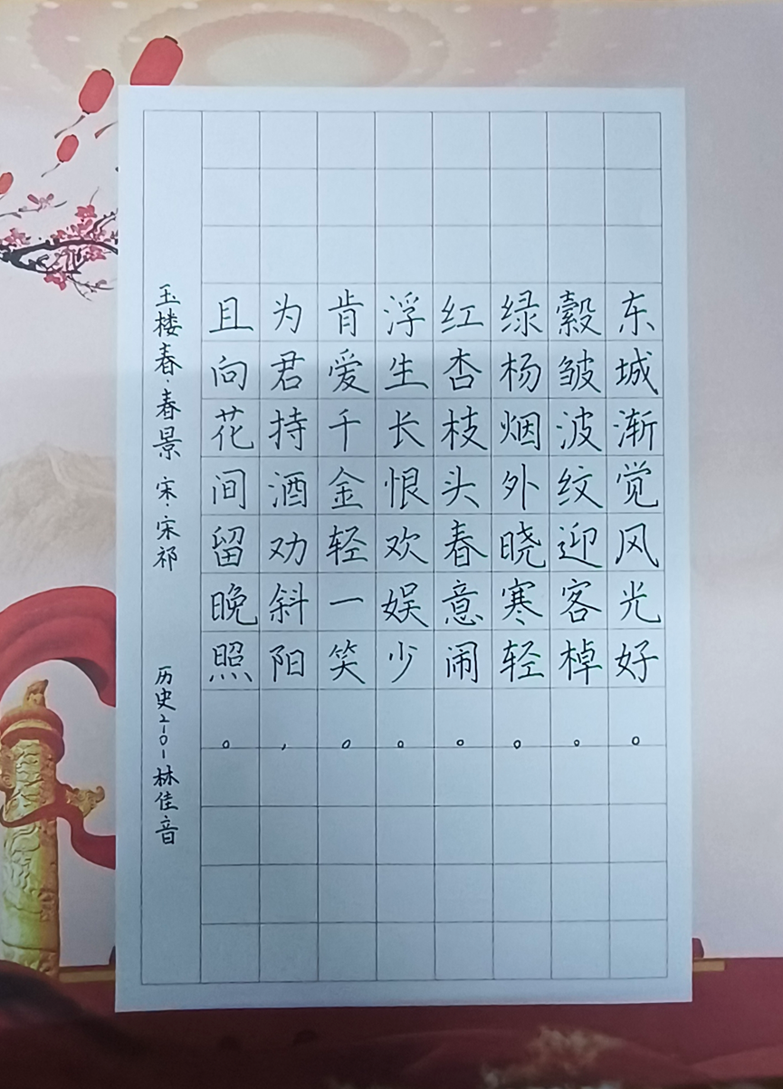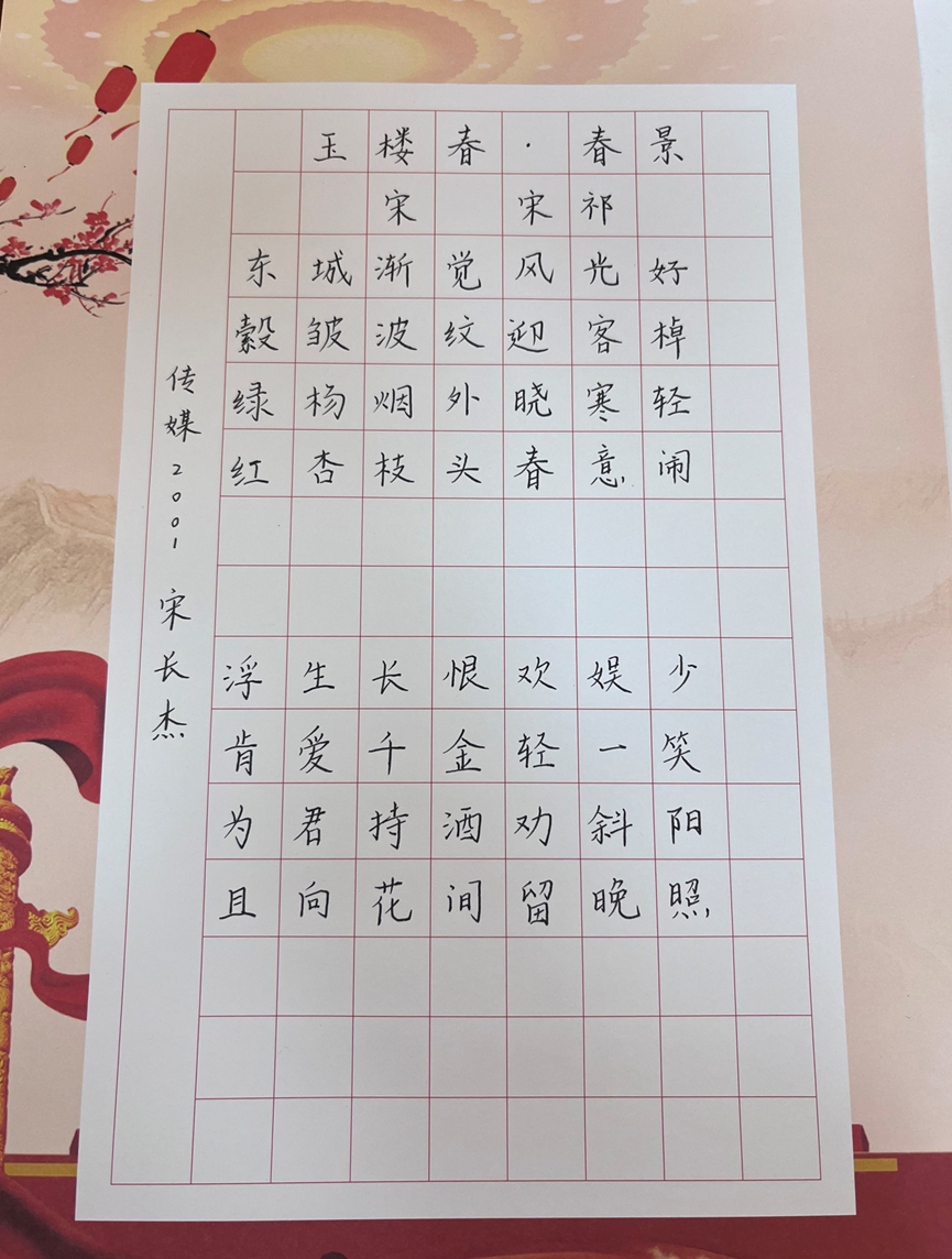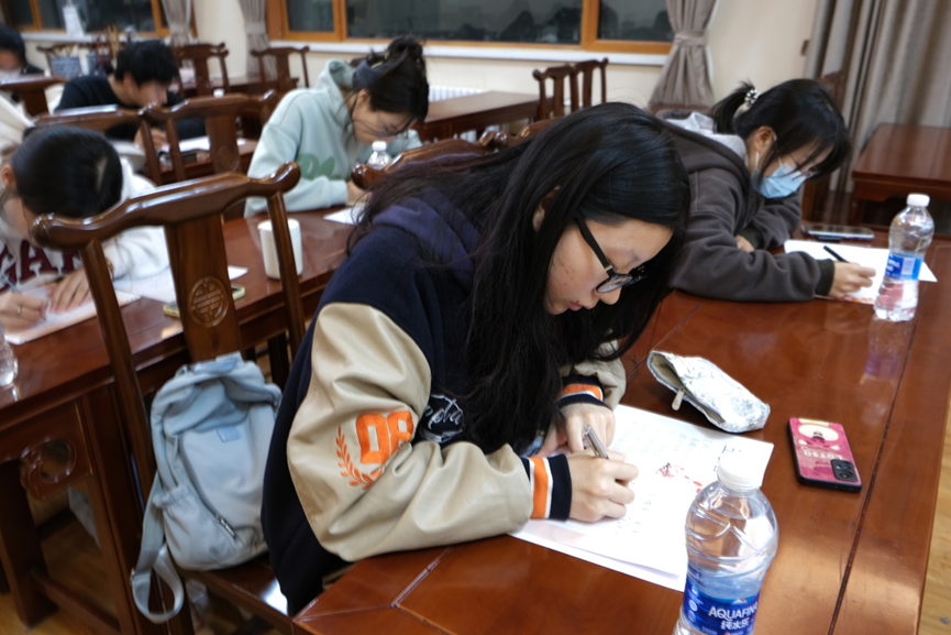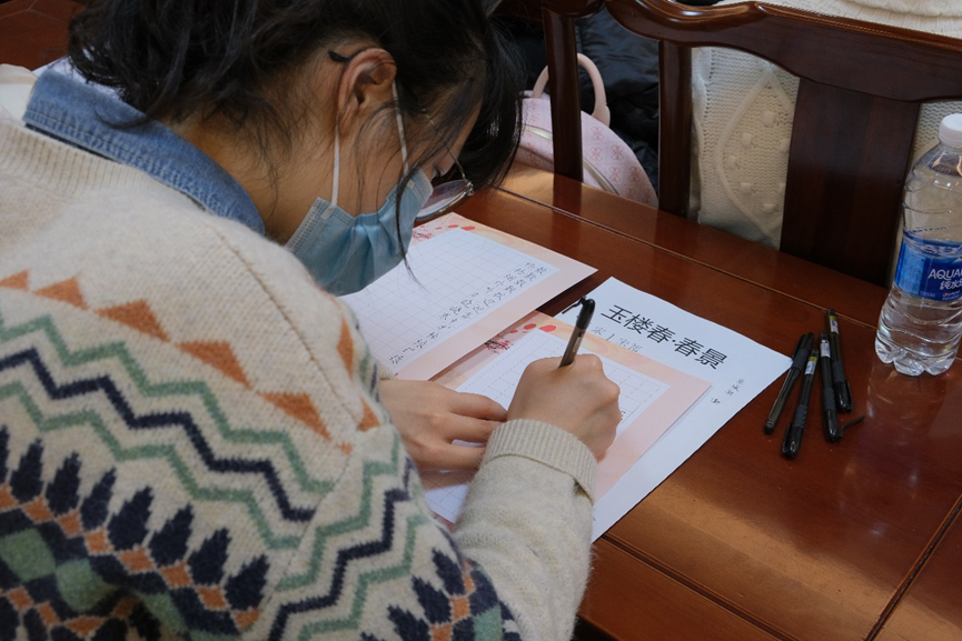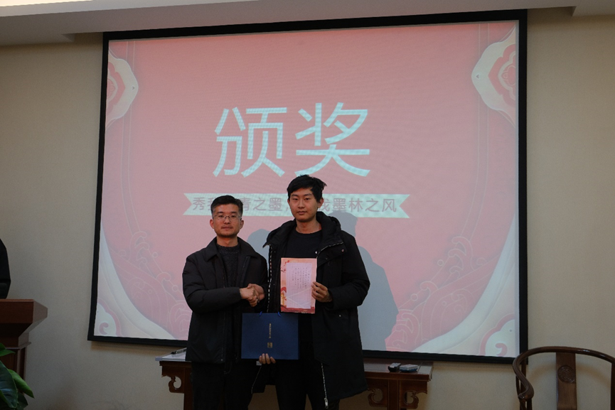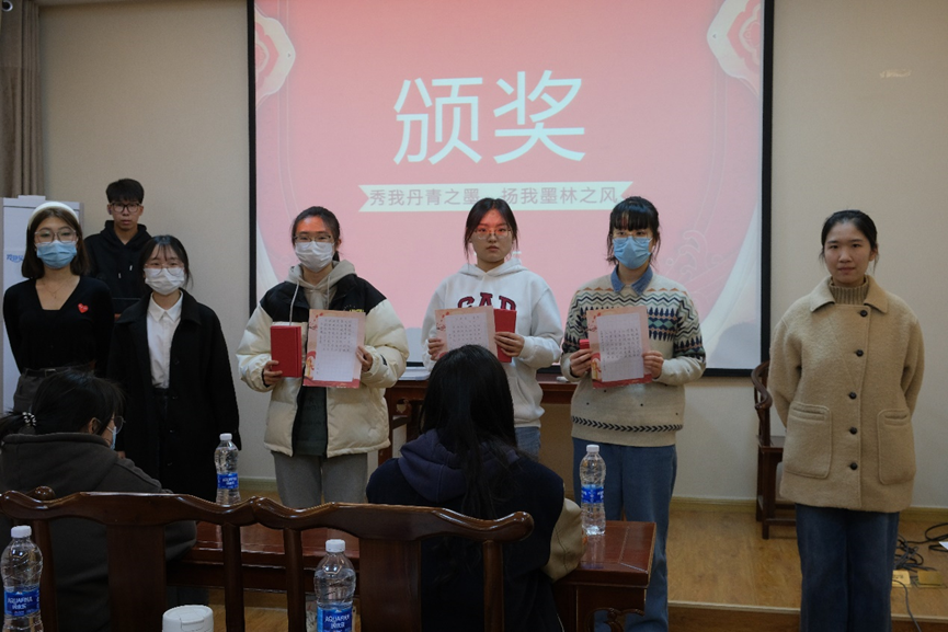 主持人宣布比賽開始后,同學們靜心書寫,逆鋒起筆、中鋒行筆、回鋒收筆,一撇一捺,文字古韻與筆尖點墨處幻化成彩蝶翩然而起,同學們的每一次提筆都仿佛是與文字的靈魂交流。書寫結束后,評委集體打分,主持人宣布此次比賽的結果。文化和旅游學院吳魯鋒老師和楊萍老師對此次活動進行了總結講評。吳魯鋒老師從六藝講起,提出應該重視書法書寫。楊萍老師則贊揚了此次活動的比賽形式,鼓勵大家潛心研究書寫、重視書寫。最后,評委為選手頒獎,選手們與評委進行合影留念。