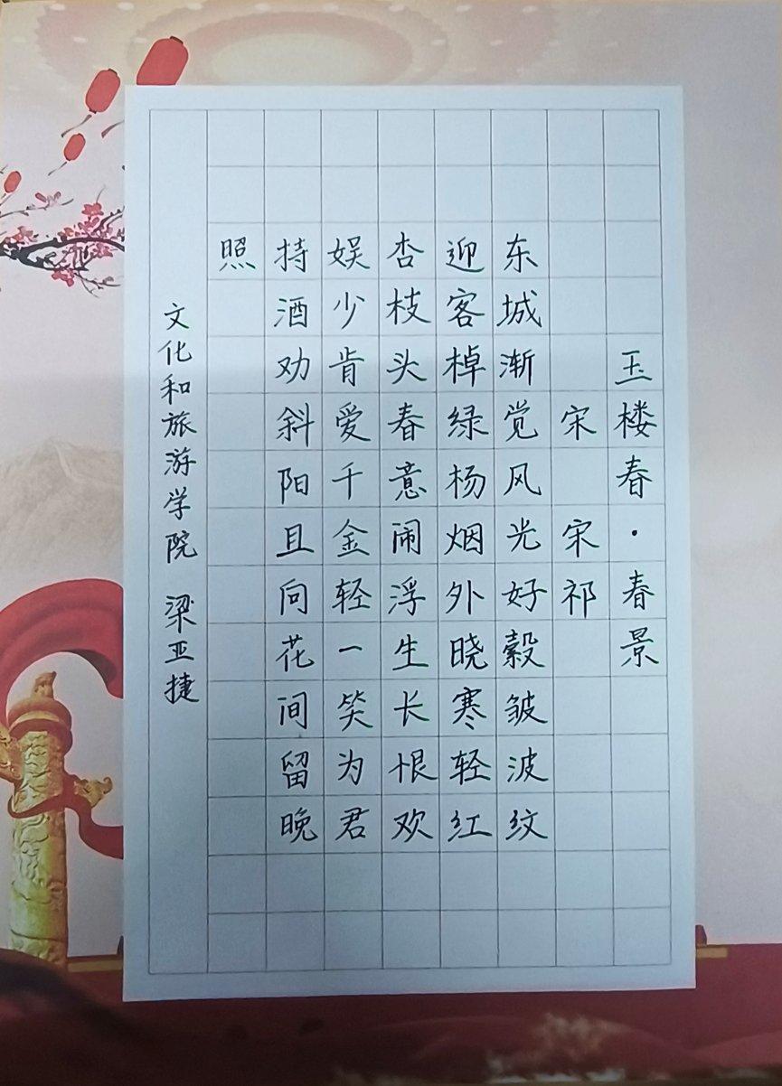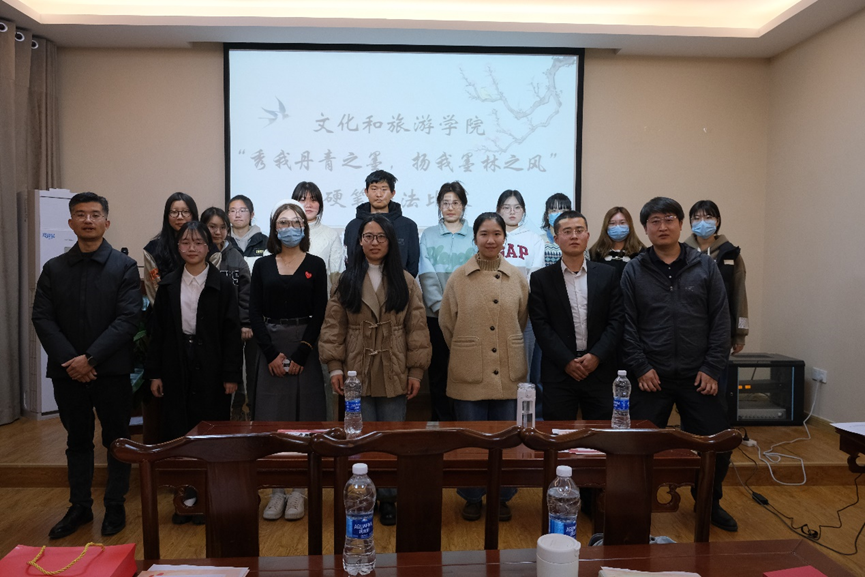為弘揚硬筆書法藝術,激發同學們對硬筆書法的興趣與愛好,提高同學們的硬筆書寫應用能力,文化和旅游學院融媒體中心于3月15日在主校區三教舉辦以“秀我丹青筆墨,揚我墨林之風”為主題的硬筆書法比賽。此次比賽有12名同學進入決賽,由文化和旅游學院、文學院、政法學院共7名師生擔任評委。