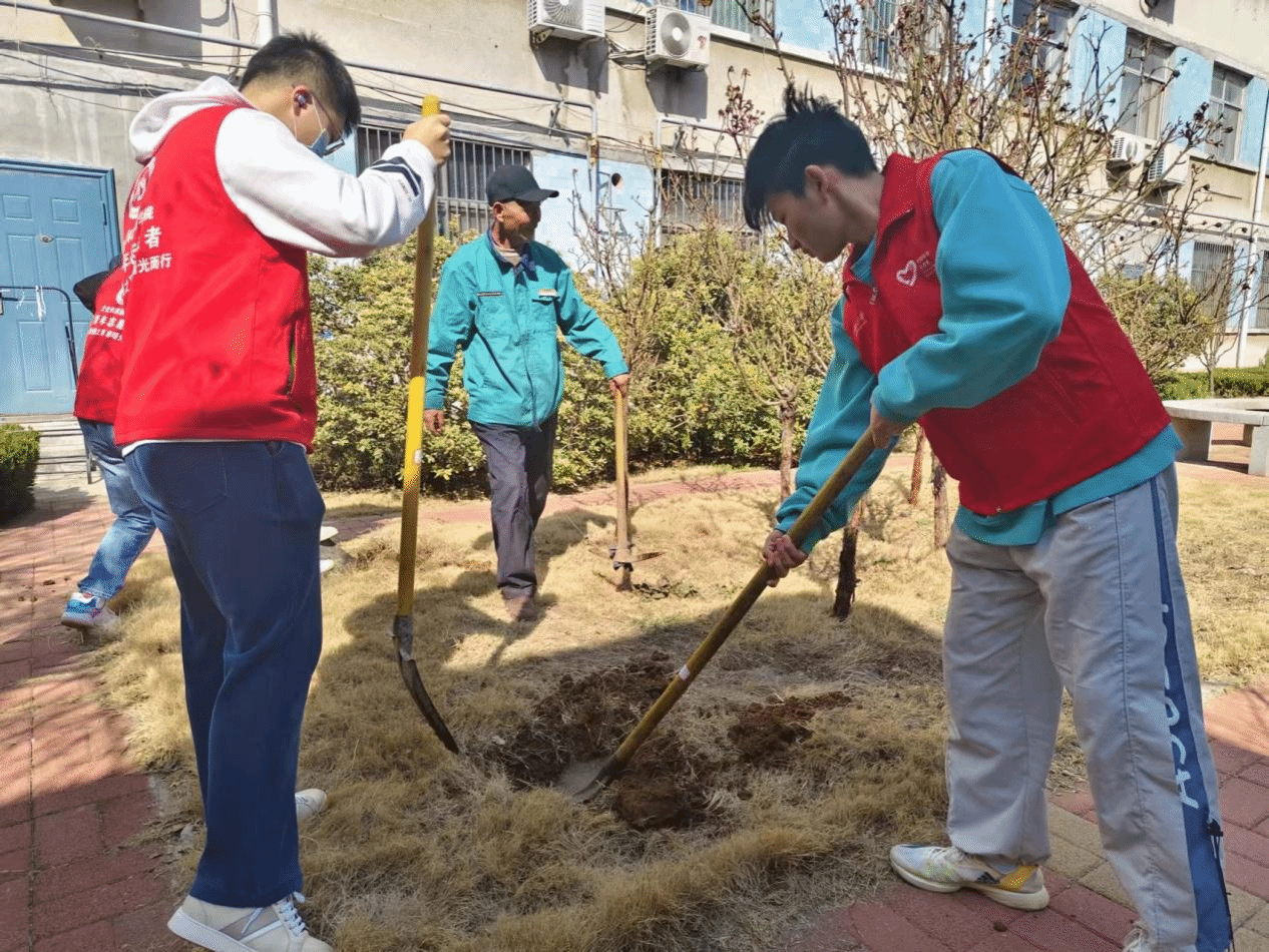 為了給樹苗創造適宜的生長環境,活動當天,志愿者們分工合作,有序清掃枯枝落葉,處理場地垃圾。活動組織者駱敬茹同學在現場向志愿者們介紹植樹節的來歷。她談到,植樹節的起源與孫中山先生有著密切聯系,他最早意識到森林重要性并號召植樹造林。為幫助同學們充分了解植樹的步驟和原理,學院還邀請了園林部門工作人員對同學們進行指導。志愿者們認真學習植樹技巧,從挖坑、培土到澆水,每一個環節都井然有序。經過一上午的努力,新栽種的棵棵小樹苗迎風而立,為文旅樓增添新的生機與活力?;顒幼詈?,同學們將寫有對未來美好期望的絲帶懸掛在枝頭,寓意為“‘植’得期待”,在這里,我們衷心祝愿他們的期望都能迎風飄揚。