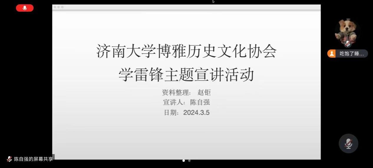博雅歷史協會開展雷鋒同志歷史事跡線上宣講活動。雷鋒同志的事跡和精神是中華民族優秀傳統文化的重要組成部分,社員陳自強圍繞雷鋒同志生平介紹和雷鋒精神解讀兩個方面展開線上宣講。他提到,雷鋒同志為人民服務,真正做到了毛主席所講的“完全”、“徹底”;雷鋒為人民為同志想得深,做得細,標準高,走到哪里就把好事做到哪里。社員們在這次宣講中進一步了解了雷鋒事跡,感受雷鋒精神。