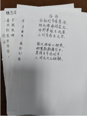 同學們以“谷雨”為主題進行詩詞和繪畫創作,他們通過查閱資料,對谷雨節氣里發生的雨潤百谷這一自然現象以及祖先對豐收的深切期盼有了更為全面的了解,創作出的作品既有對春雨滋潤大地的贊美,也有對農家生活樂趣的描繪。他們以詩詞為媒,進而對詩詞描繪的場景進行繪畫創作?;顒咏Y束后,同學們將詩詞和畫作裝訂成冊,贈予曉愛殘障人士康復中心的孤獨癥兒童,希望他們能夠了解自然與人類的緊密關系以及中國傳統文化的獨特魅力。活動參與者肖貴賓同學表示,此次活動讓同學們對谷雨這一節氣有了更深入的了解,也為同學們提供了為孤獨癥兒童獻愛心的機會。