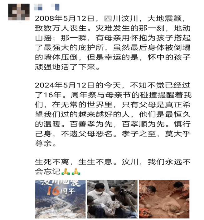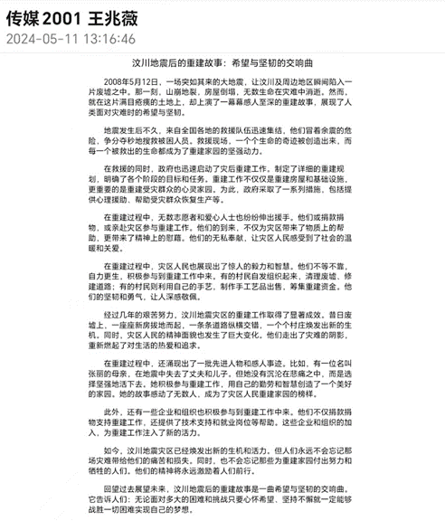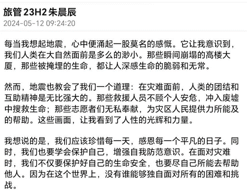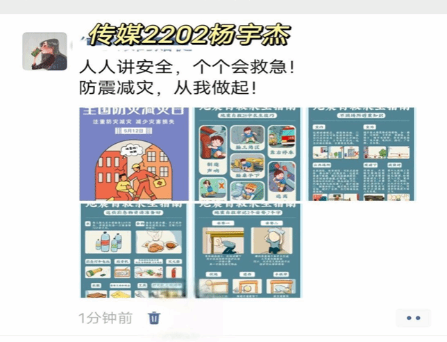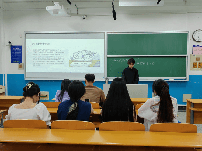 本次活動分為主題宣講和宣傳感悟兩部分。宣講當天,大家向在“5·12”汶川大地震中死難的同胞默哀,回顧歷史,分享英雄事跡,緬懷抗震救災英雄不懼犧牲、無私奉獻的偉大精神。面對抗震救災的歷史畫面,同學們被深深地觸動,他們為在災難中失去家園和生命的人們感到悲痛,也對無私奉獻、英勇救災的人們致以敬佩。隨后,大家觀看防震科普視頻,學習防震防災必備技能。宣講結束后,活動參與同學在線上社交平臺通過分享防災減災知識和個人感悟,展示汶川地震后的重建故事,號召大家提高防震減災意識,銘記歷史,緬懷先烈。同時,同學們將防災宣傳語如“密切關注預警信息”“提前準備應急物資”“制定應急方案”等寫在便利貼上制作成活動展板幫助全院同學普及防震減災知識。活動參與者陳言涵表示,她會時刻銘記歷史,緬懷先烈,同時會牢記了解到的防震知識,在必要的時候能夠冷靜應對。