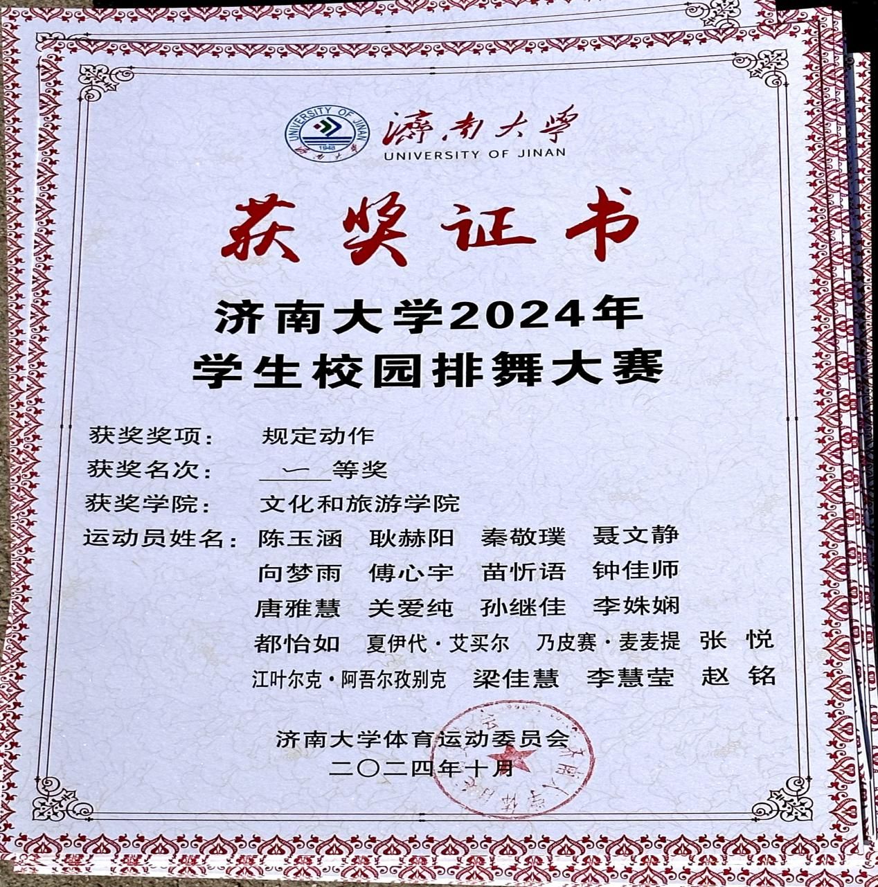 秋風輕拂,落葉紛飛,10月22日,濟南大學2024年學生校園排舞大賽在主校區田徑場成功舉辦。本次大賽由濟南大學體育運動委員會主辦,共青團濟南大學委員會和濟南大學體育學院聯合承辦。全校共計20所學院400余名成員齊聚賽場,展開激烈角逐。其中,文化和旅游學院排舞隊憑借出色表現,取得規定動作一等獎和自選動作二等獎的好成績。