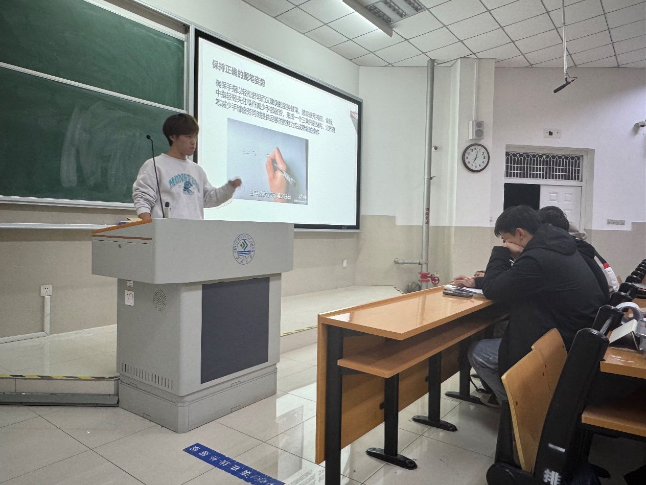 活動中,主講人李青雨同學以漢字書寫為主題展開分享。他詳細闡述了寫字的益處,指出寫字不僅能夠鍛煉耐心與專注力,還能提升個人的文化修養與審美水平。李青雨同學結合自身經驗,向同學們介紹了漢字書寫的基本方法,包括正確的握筆姿勢以及字體結構的把握等,并通過播放相關視頻資料,生動形象地幫助同學們理解漢字書寫的要點與精髓。