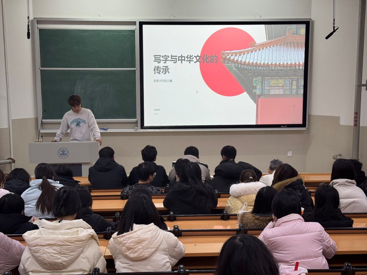 為豐富同學們的校園生活,充分發揮同學們的特長與技能,2024年12月3日,濟南大學文化和旅游學院于舜耕校區D3J101教室開展朋輩技能特長大會。李青雨同學作為主講人向同學們講解漢字的書寫與中華優秀傳統文化之間的關系,同學們踴躍參加,學習有關書寫的相關知識。