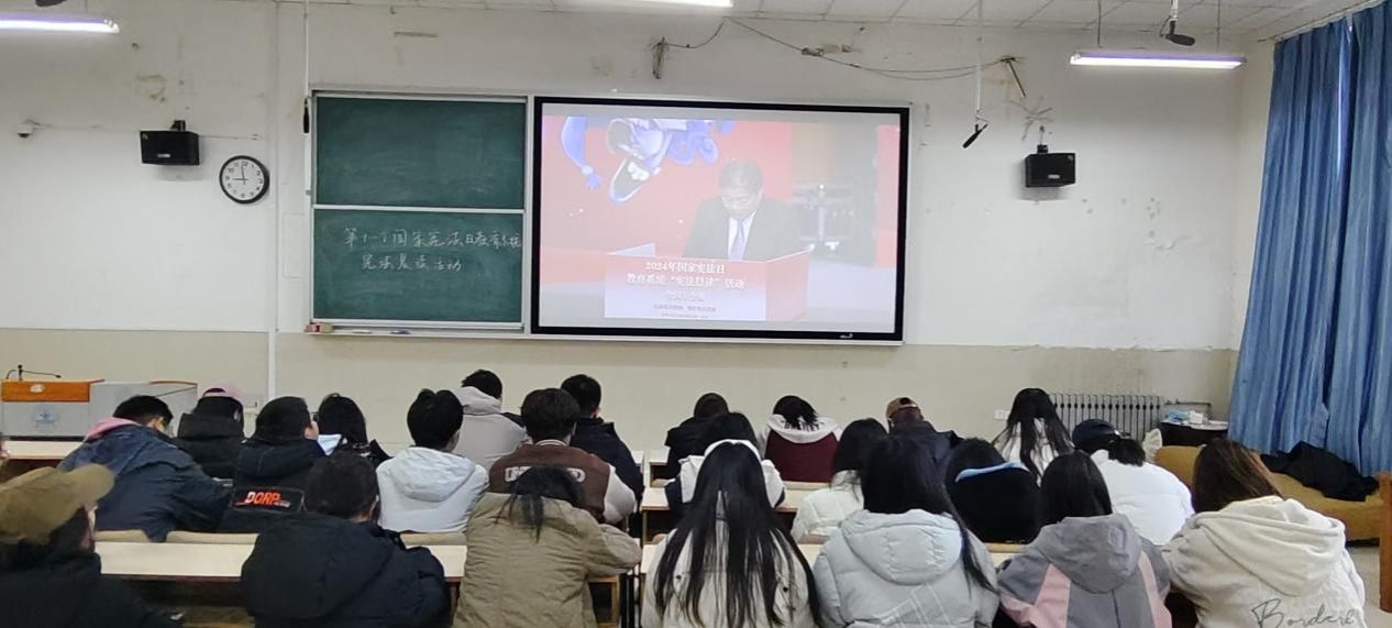 為全面貫徹黨的二十大精神以及黨的二十屆二中、三中全會精神,堅定不移地以習近平新時代中國特色社會主義思想為指引,深入學習貫徹習近平法治思想,進一步弘揚憲法精神,全面增強學生的法治意識,在第11個國家憲法日和第7個憲法宣傳周到來之際,文化和旅游學院于12月4日在階梯教室組織學生觀看“憲法晨讀” 直播活動。