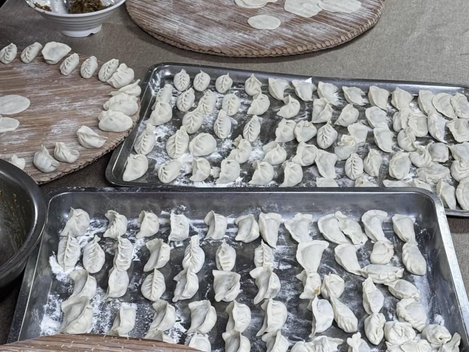 一抵達基地,大家就迅速分工,全力投入到包餃子的準備工作中。和面的志愿者們手法嫻熟,將面粉與水巧妙融合,不一會兒,原本松散的面粉就變成了柔韌的面團;搟面皮的志愿者們雙手飛舞,一張張薄厚均勻的面皮快速擺滿案板;調制餡料的志愿者們更是用心,精心搭配每一種食材,只為給孩子們呈上最美味的餃子。