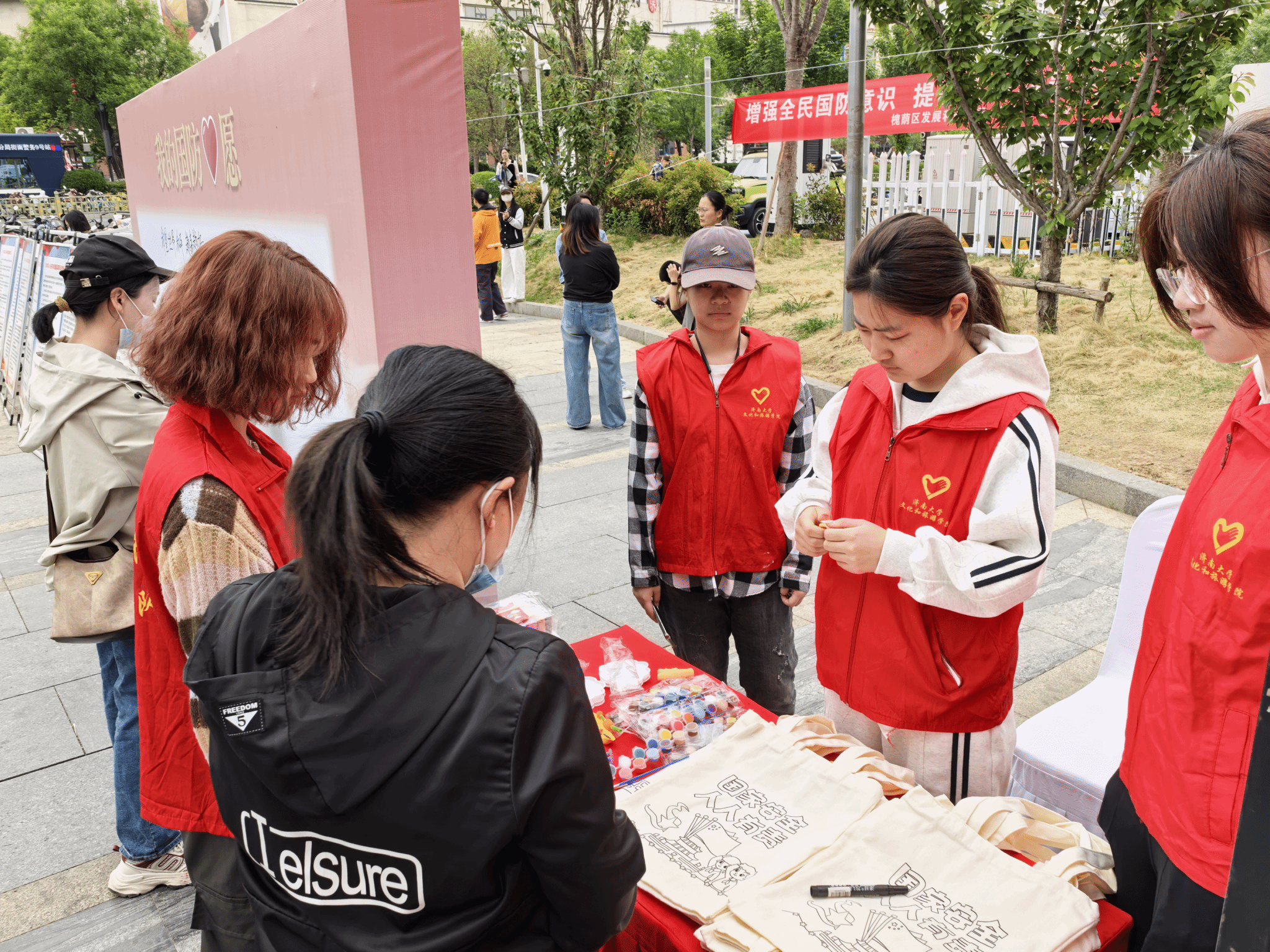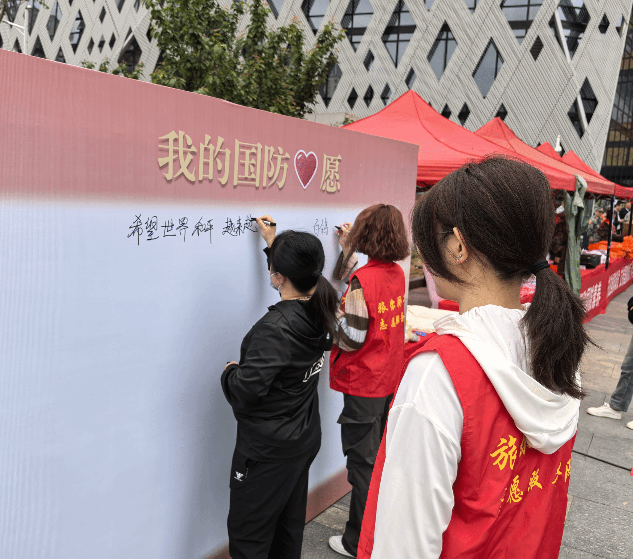 為深化全民國防教育、增強社區居民國家安全觀念,2025年4月27日上午“壹點公益”在弘陽廣場成功舉辦“國防教育進社區”主題活動,濟南大學文化和旅游學院“逐光”青年志愿者協會志愿者到場提供服務。活動通過心愿寄語、手工創作、普法講座等沉浸式體驗,以寓教于樂的形式激發居民愛國熱情,推動國防教育融入日常生活,獲得社區居民一致好評。 國防心愿墻:書寫家國情懷 活動現場設立的“我的國防心愿墻”成為焦點,志愿者們引導居民寫下對強軍事業的祝福與期盼。“愿祖國山河永固”“向戍邊戰士致敬”……一條條真摯留言匯聚成紅色海洋。志愿者孫繼佳表示:“居民們熾熱的情感讓我們深刻體會到國防教育的必要性。”