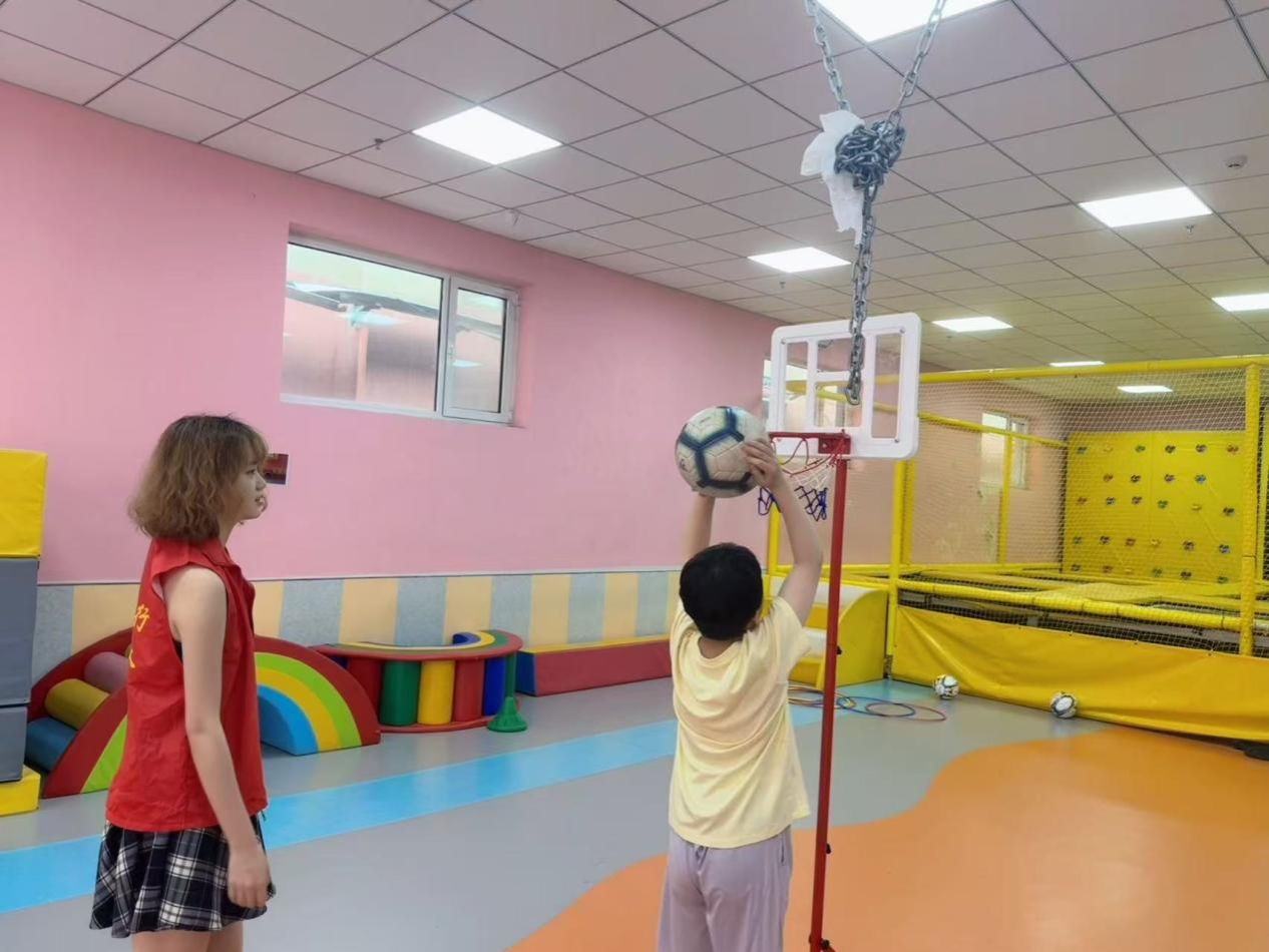 康復中心的室內運動場,是孩子們活力釋放的樂園。孫繼佳與孩子們圍聚在一起,開啟了特別的體育課。籃球在地面上跳躍,每一次彈起都伴隨著孩子們的笑聲。孫繼佳耐心地示范著投籃動作,手把手幫助孩子們調整姿勢,鼓勵他們勇敢嘗試。對于一些平衡能力較弱的孩子,孫繼佳會放慢節奏,扶著他們的肩膀,陪著他們慢慢移動腳步,引導他們感受籃球在空中劃過的弧線,在運動中鍛煉平衡能力。在汗水與歡笑交織中,孩子們逐漸掌握了籃球的小技巧,他們的眼神中閃爍著自信與快樂,小小的身軀在運動場上充滿了力量。
