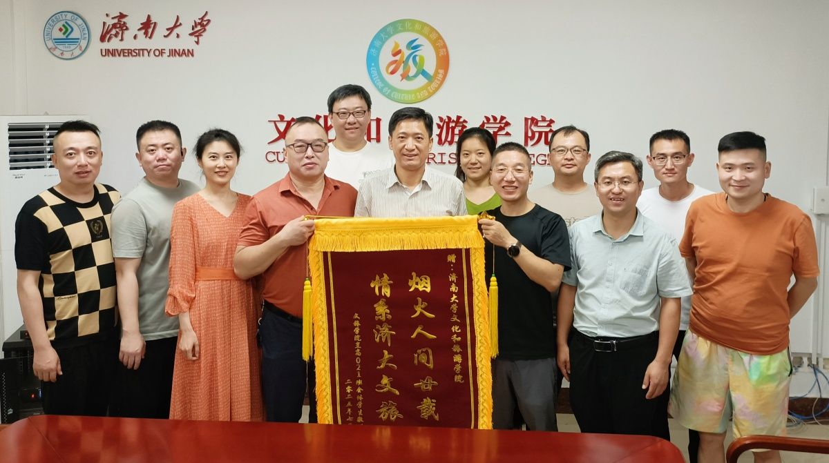 座談會上,校友們逐一分享了畢業(yè)后的工作經(jīng)歷和人生感悟。并向?qū)W院贈送了一面寫有“煙火人間廿載,情系濟(jì)大文旅”的錦旗,表達(dá)對母校和老師們的感激之情。校友們紛紛表示,無論走到哪里,烹高021班的同學(xué)們始終以母校為榮,并將繼續(xù)關(guān)注和支持學(xué)院的發(fā)展。孟德洋代表學(xué)院接受錦旗,并為校友們贈送了學(xué)院精心準(zhǔn)備的紀(jì)念品,希望校友們永遠(yuǎn)銘記母校的培育之恩,在未來的人生道路上繼續(xù)砥礪前行。
